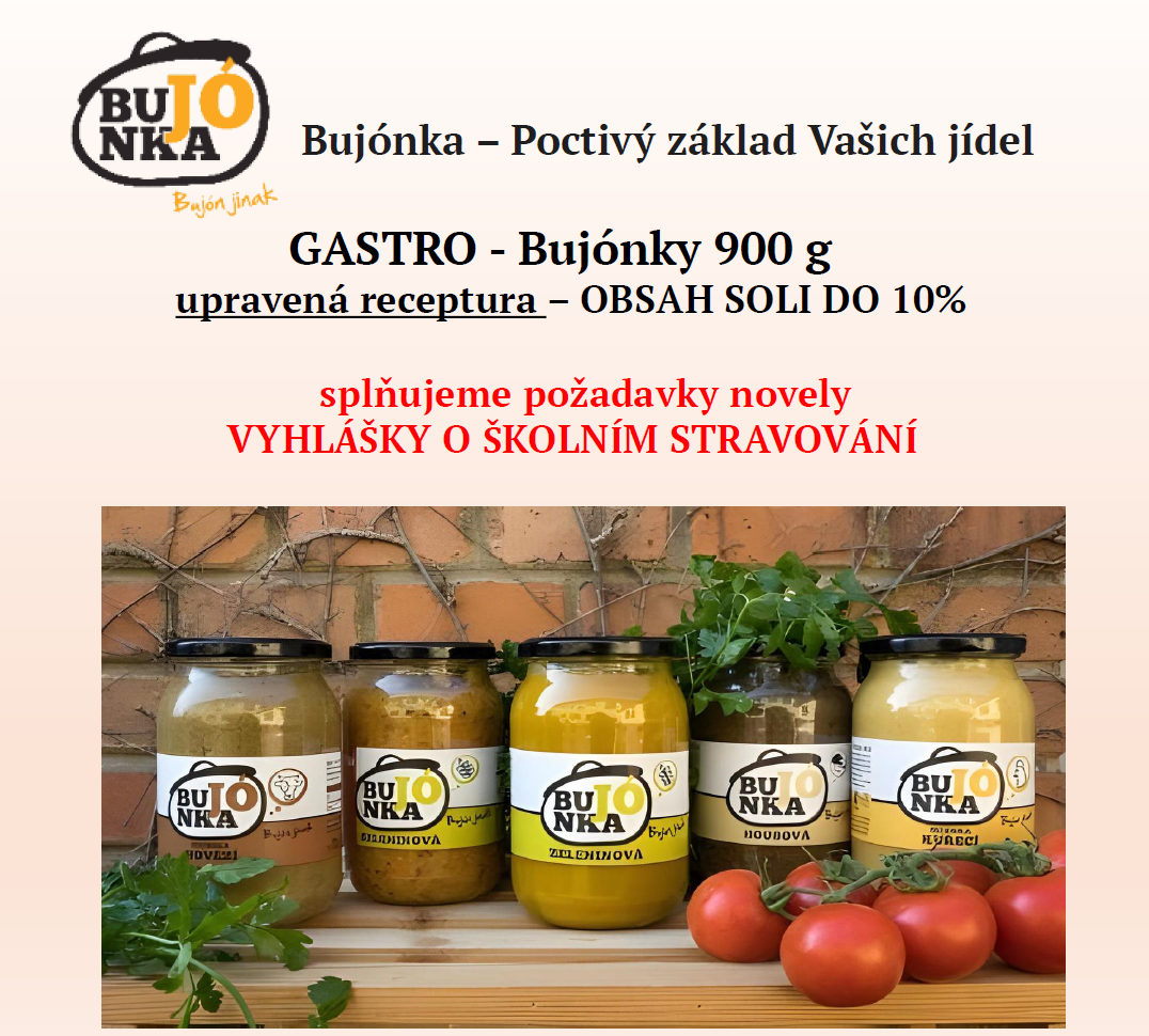 Nabízíme školním jídelnám dochucovadla: hovězí, kuřecí, zeleninový, houbový. Vše vyrobeno z kvalitních surovin od drobných farmářů a pěstitelů na jiižní Moravě. Gastro balení dodáváme v gramazi 900g, po domluvě můžeme vyrobit i větší.
