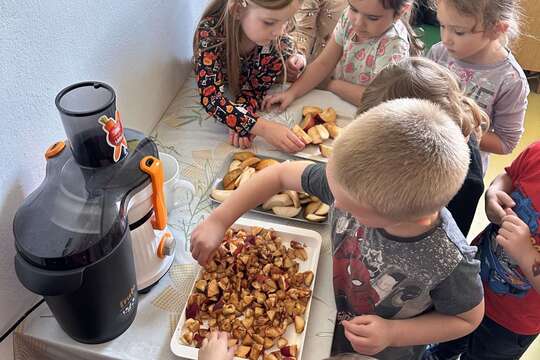 Děti se vydaly do sadu, kde nasbíraly spoustu voňavých jablek a hrušek. Každý si vybral ty nejhezčí plody a s nadšením je přinesl zpět do školy. Potom si ovoce sami...
