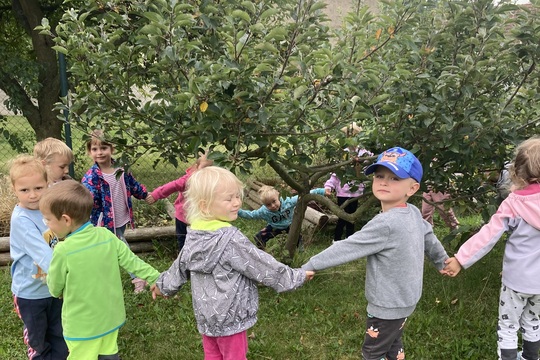 Po ochutnávce jablek jsme při pobytu venku vyhledali společně jabloň, od které jsme ochutnávali jablka. Vytvořili jsme společně kolem živý plot, prohlédli, určili části...
