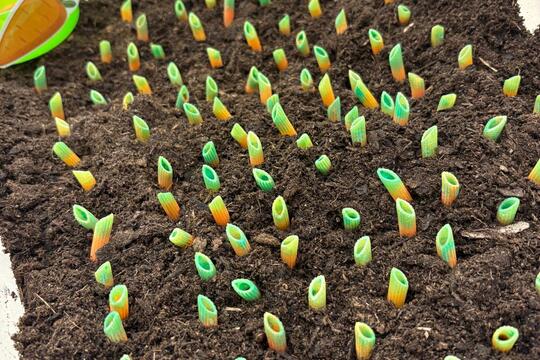PROCVIČUJEME JEMNOU MOTORIKU Dnes si děti hrály na malé zahradníky. Do „hlíny“ nejprve zasadily obarvené těstoviny, které představovaly mrkvičky, a potom je pomocí...