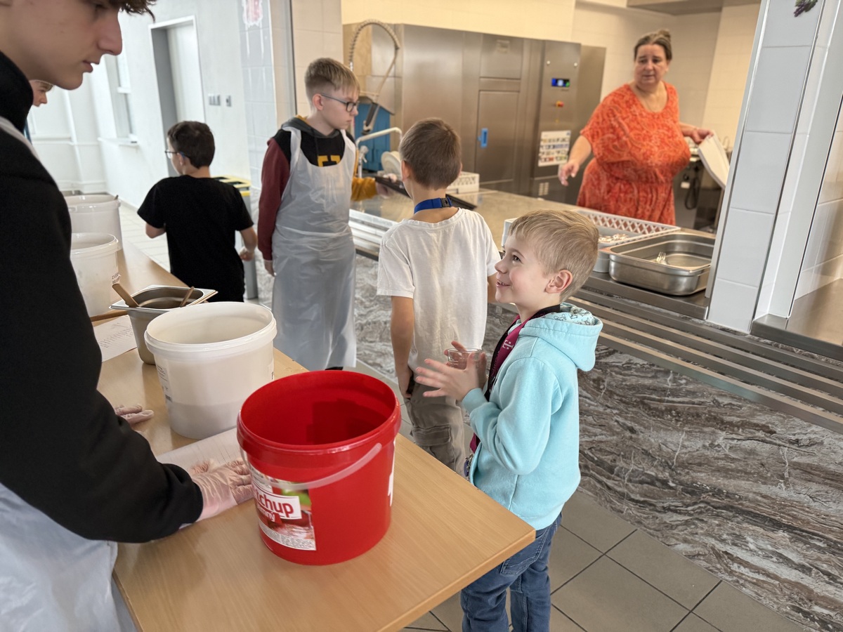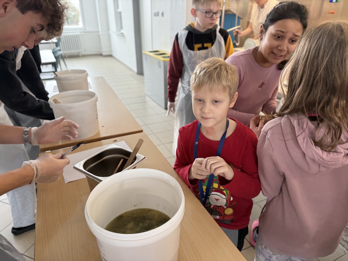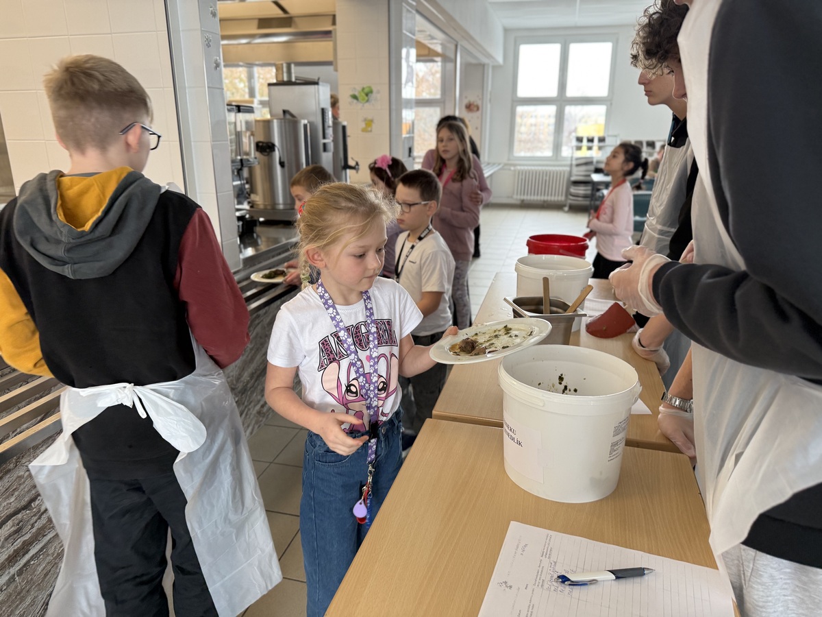 Dnes na naší škole proběhl audit plýtvání jídlem, který se zaměřil na to, kolik jídla skutečně končí v odpadu – a hlavně proč. Do akce se zapojili žáci vyšších ročníků, kteří společně s mladšími spolužáky třídili zbytky jídel do předem připravených kyblíků.