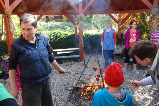 Nejdříve jsme si s dětmi postavili plán, co potřebujeme udělat. Pak jsme pozdravili Slunce, aby nám svítilo na naši práci. No a poté už nikdo nemeškal, a společně se všichni vrhli do práce. Do školičky zavítalo na dvacet prarodičů a dětem byli velkými pomocníky i rádci. V závěru velmi nádherného dopoledne, které se vydařilo i díky úžasnému počasí, jsme se všichni sešli v domečku sovičky Jůly, kde nám paní uklízečky v kotlíku uvařily ovocný čaj ze zamražených plodů naší zahrady. K dobrému čaji jsme našim prarodičům nabídli dětmi upečený štrůdl a pak si všichni společně opekli jablka a v popelu brambory, jako tomu bylo za časů našich babiček a dědečků.