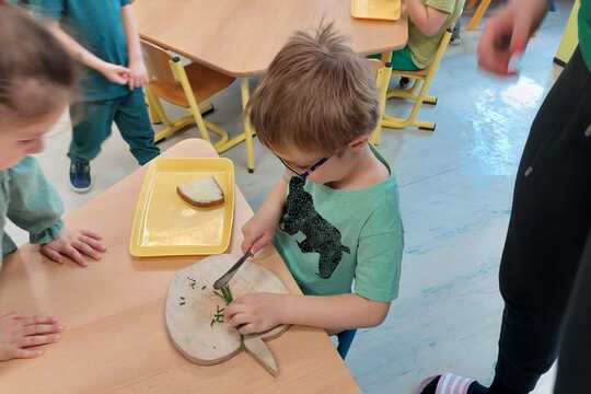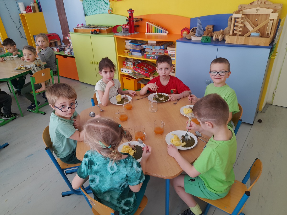 Zelený čtvrtek jsme si v naší MŠ udělali skutečně zelený. Všichni jsme se zapojili do výzvy přijít v zeleném oblečení. V průběhu dne jsme zkoumali, co vše může být zelené. Pažitkou z naší školkové zahrádky jsme si ochutili a ozdobili svačinku, na kterou byla vajíčková pomazánka. K obědu nám pak paní kuchařky připravily zeleňoučký špenát.