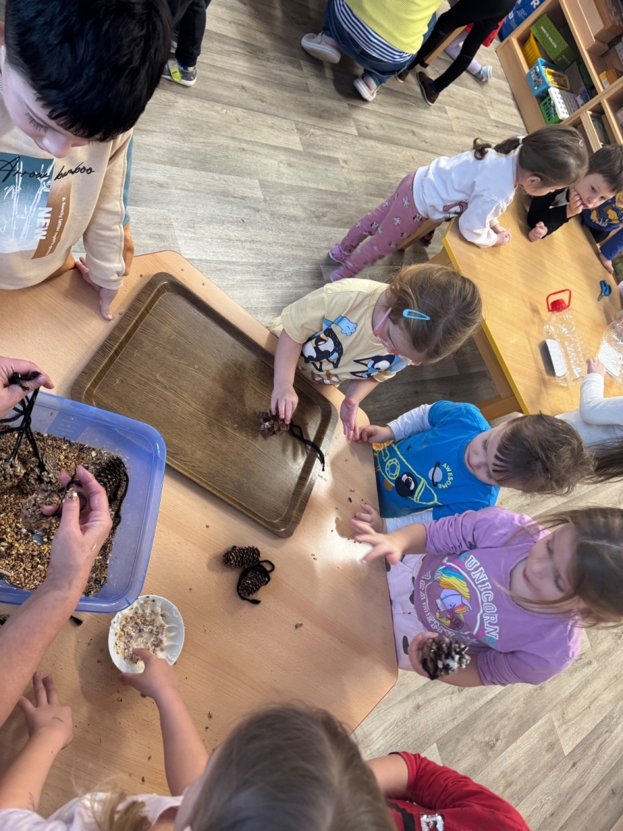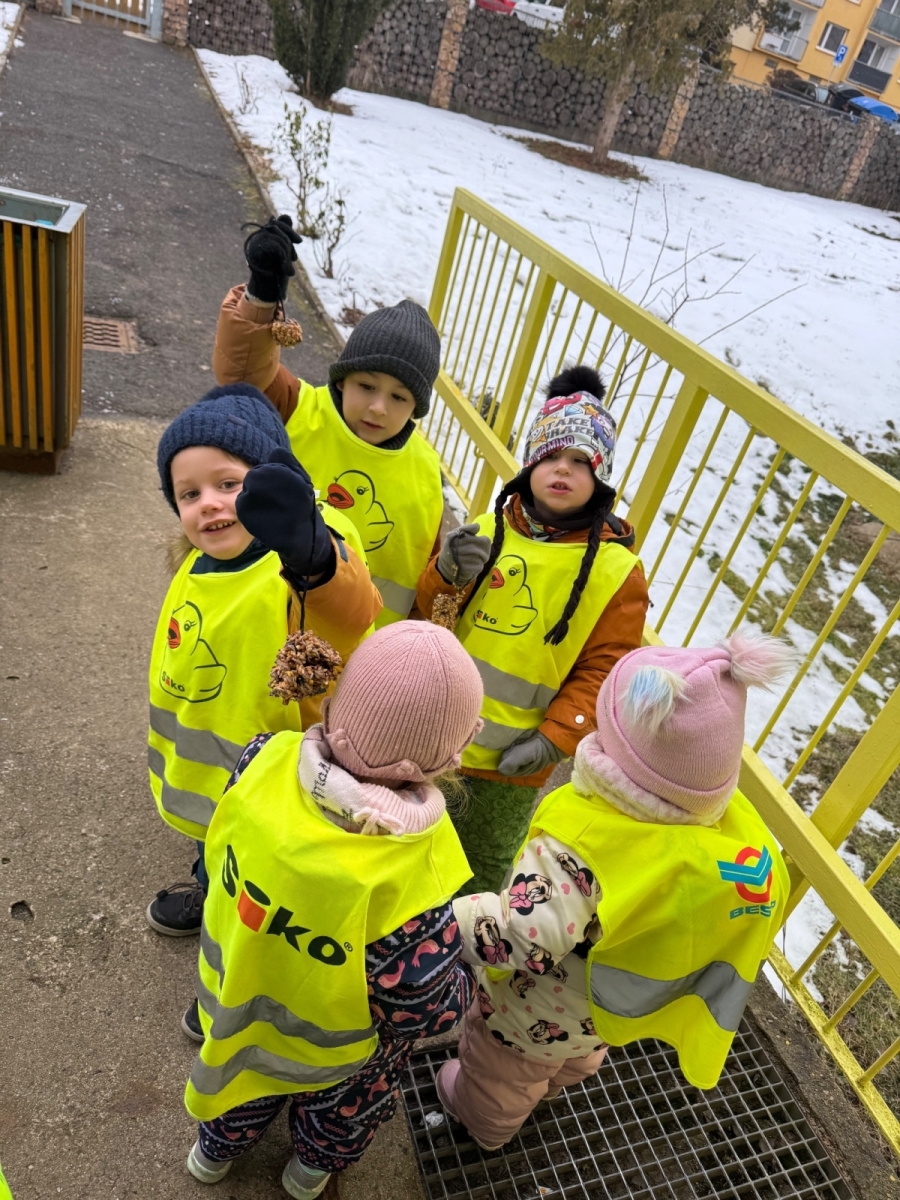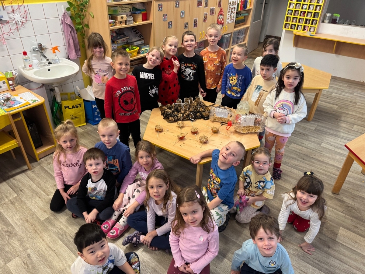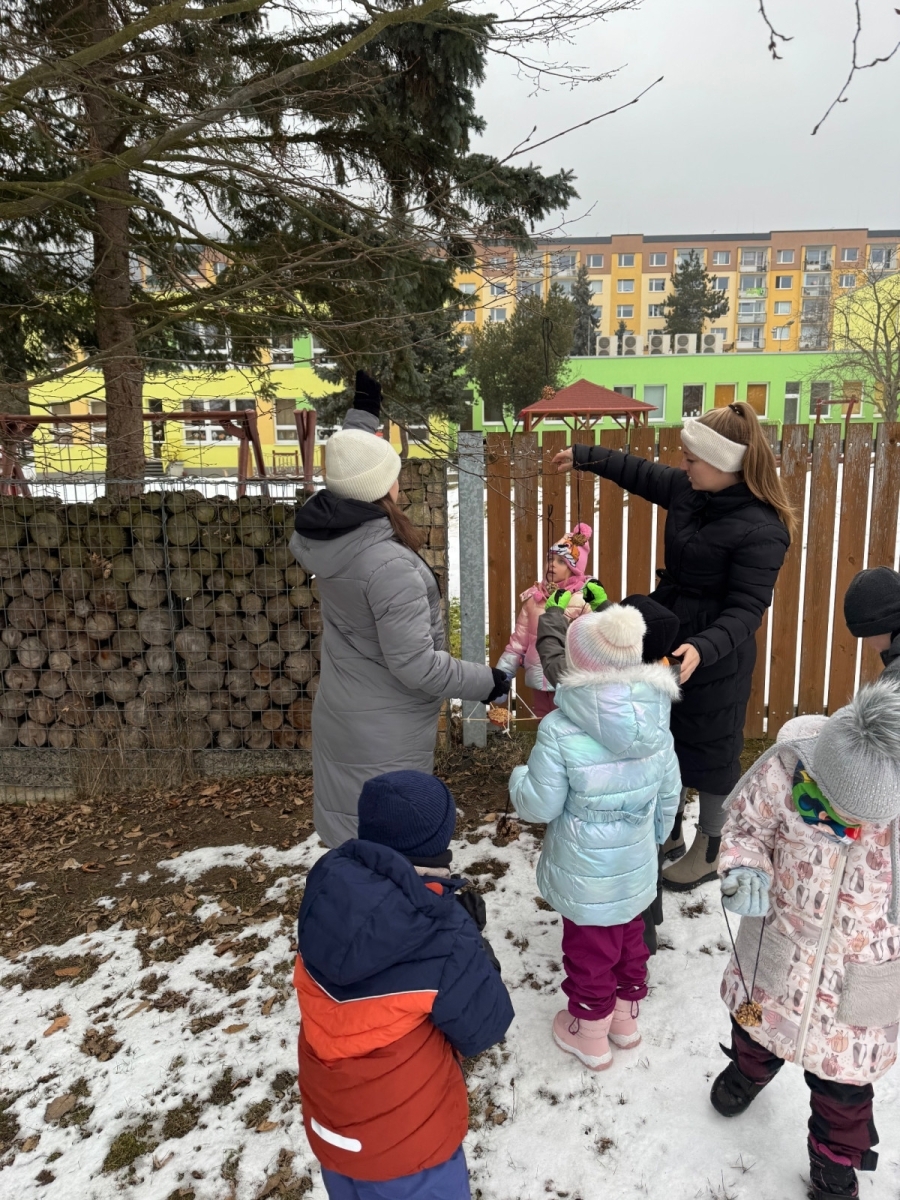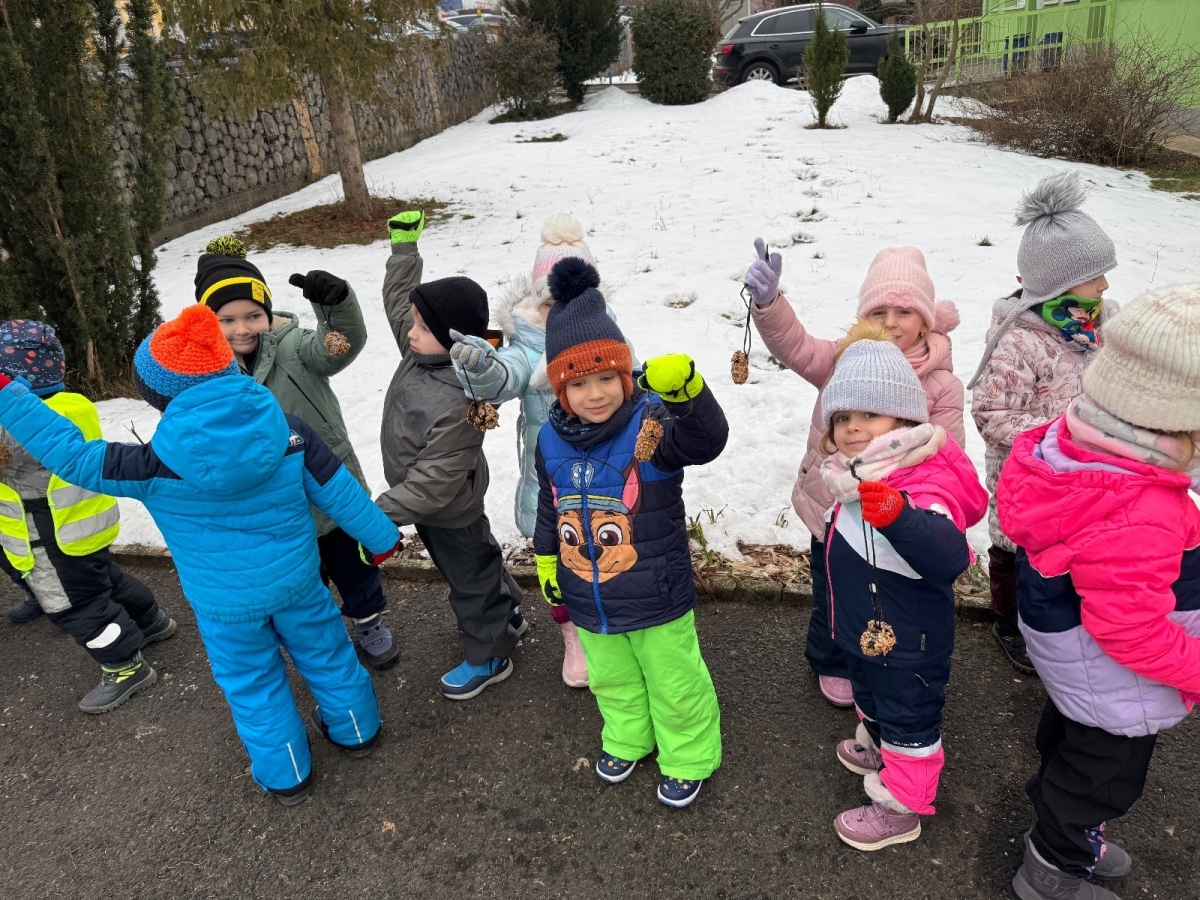 Dnes se třída Motýlků a Berušek společně věnovala výrobě krmítek pro ptáčky. Děti pracovaly na několika stanovištích – vyráběly krmítka z ruliček, jablíčka se semínky, krmení ze šišek a krmítko z PET lahve. Následně jsme se vydali na procházku, kde děti své výrobky umístily venku do přírody. Děti si činnost moc užily a s nadšením pozorovaly, jak mohou ptáčkům v zimě pomoci. MŠ Sluníčko myslí na zvířátka i v zimě.