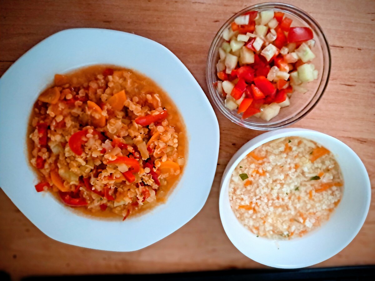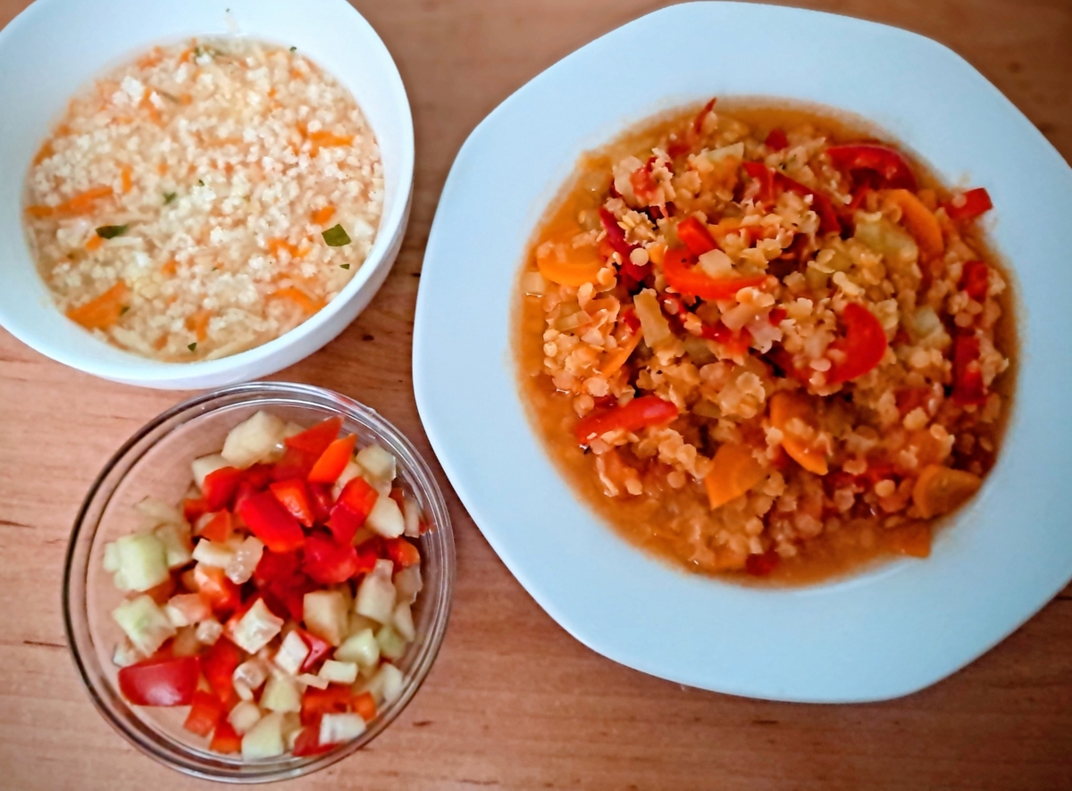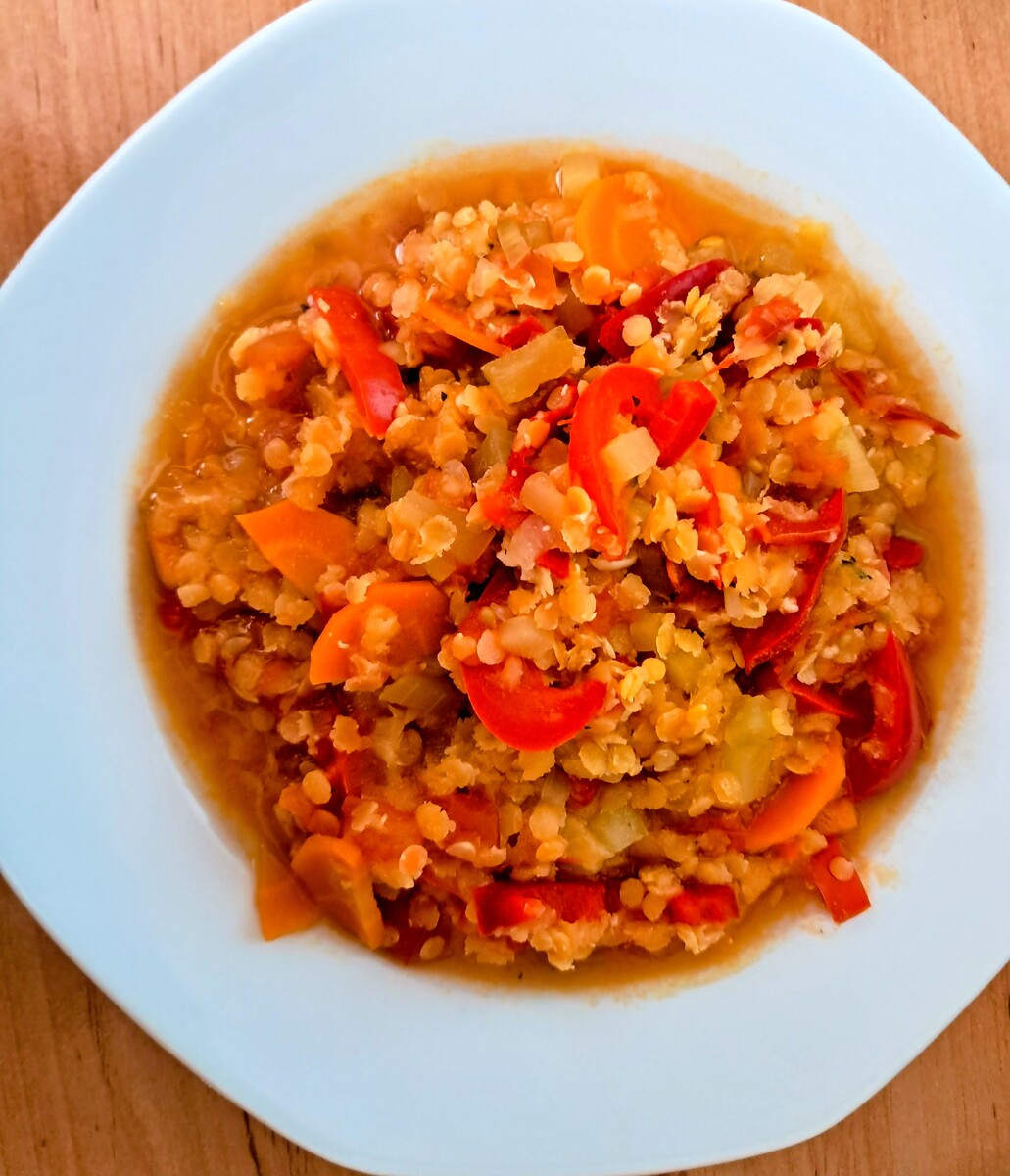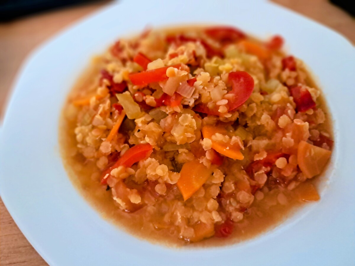 BIO čočkový kotlík (červená čočka, mrkev, cuketa, červená paprika, rajčátka)