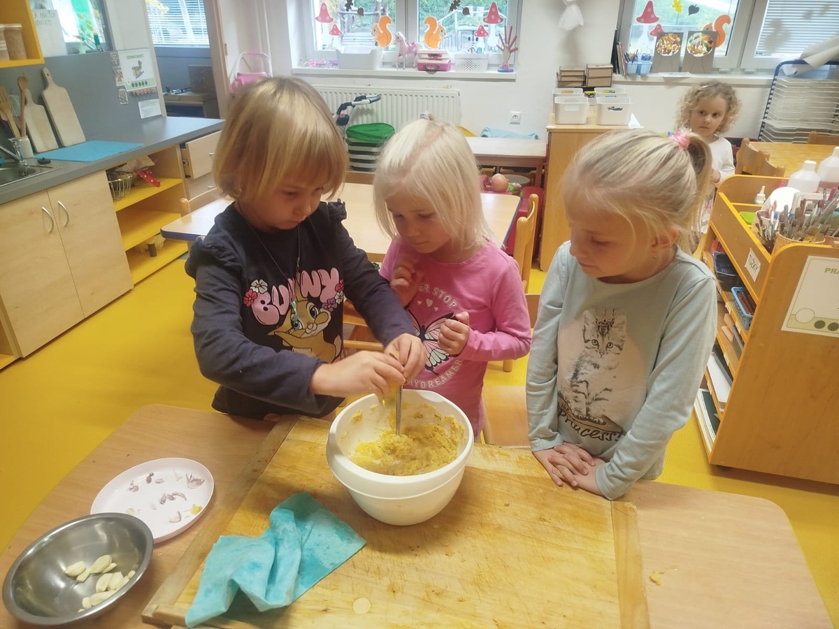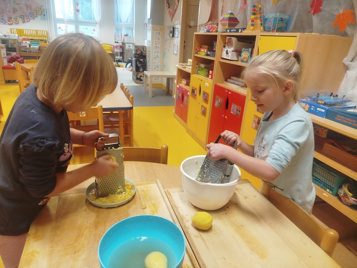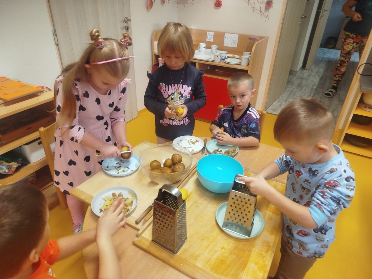 Dnes jsme si ve třídě užili voňavé dopoledne plné vaření! Děti si samy připravovaly malé bramboráčky z brambor, které jsme společně nasbírali na naší školní zahradě. Nejprve si brambory pečlivě očistily, oloupaly a nastrouhaly. Poté přidaly vajíčko, mouku, špetku soli a podle chuti i trochu majoránky a česneku.