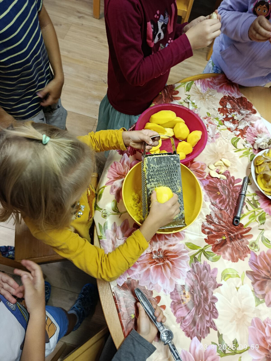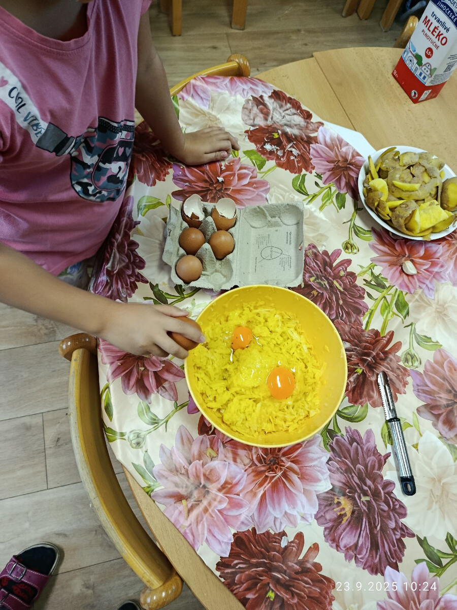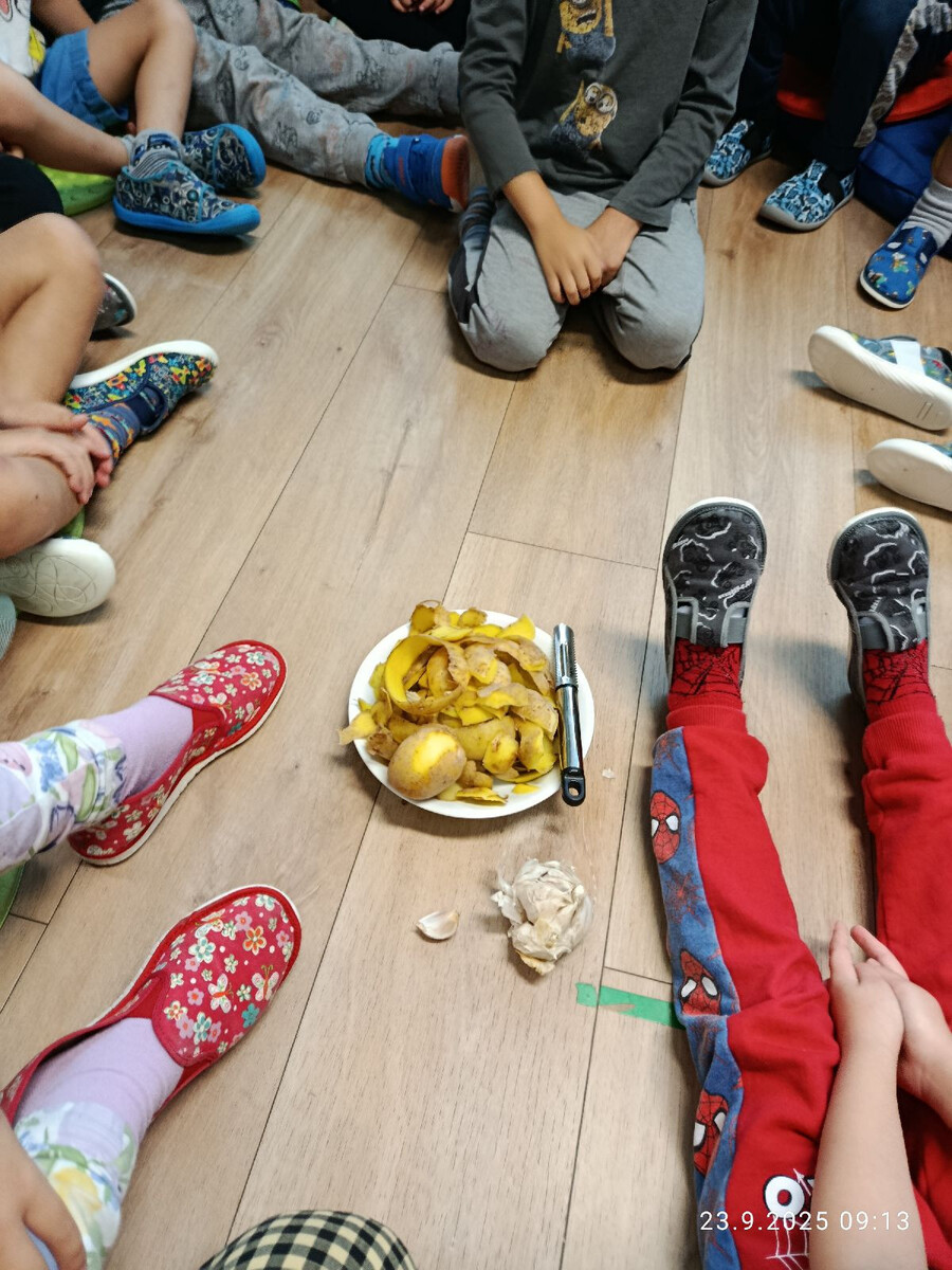 V září si pravidelně upevňujeme znalosti a vědomosti o zelenině a ovoci. Třídíme, malujeme, pečeme, sklízíme a samozřejmě ochutnáváme. A tentokrát jsme se soustředili na brambory - nesměla chybět bramborová tiskátka, pečení bramboráků a nejvíc nám chutnaly pečené brambory, které si děti samy oloupaly, nakrájely a upekly. Pochválily nás dokonce i paní kuchařky, které přilákala vůně pečených brambor do naší ,,dětské" kuchyňky.