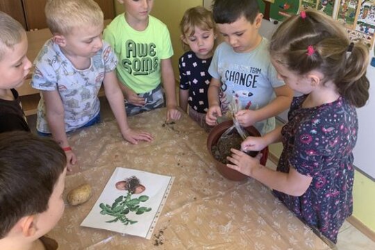 Na podzim si povídáme o ovoci a zelenině. Probírali jsme brambory a jelikož děti neměly dostatek poznatků o sázení brambor, tak jsme se rozhodli je zasadit. Řekli jsme si postup