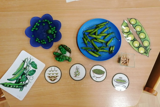Jemnou motoriku si děti procvičovaly modelováním kuliček hrášku z modelíny, porovnávaly velikosti mezi s sebou, balily je do lusků. Srovnávaly je se skutečnými lusky a hrášky. Hledaly rozdíl zelený hrášek x suchý hrášek.