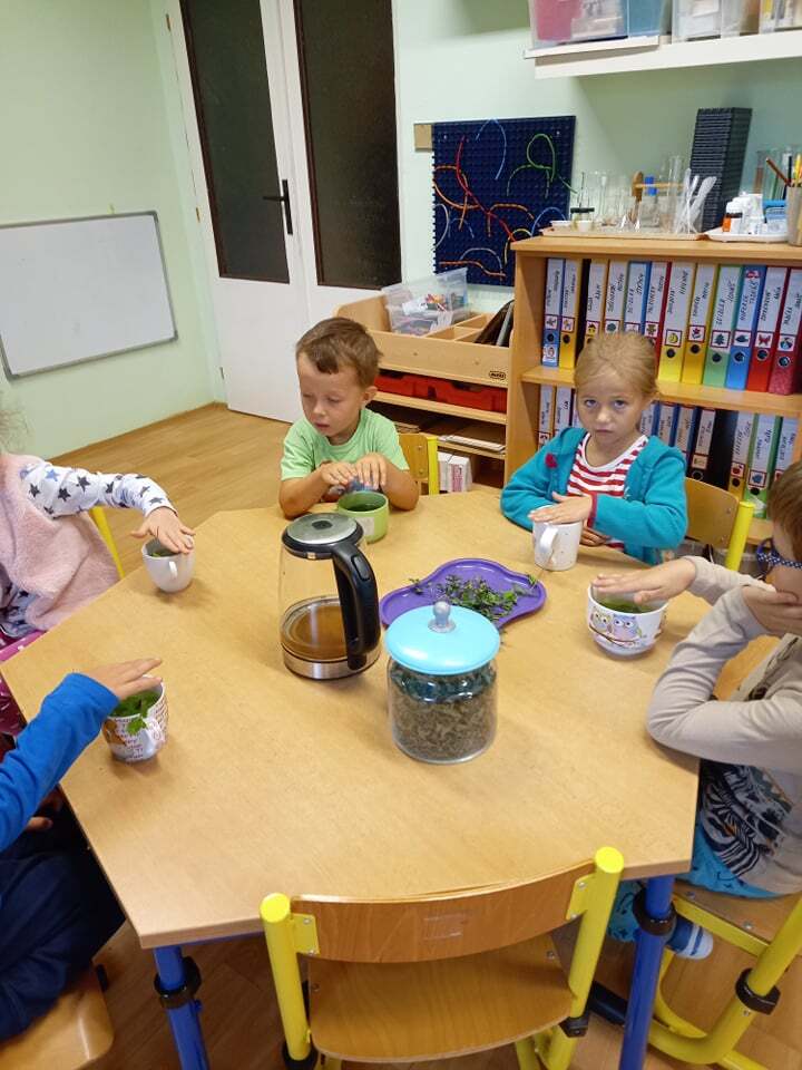 V období babího léta děti sbíraly a sušily s p. učitelkami bylinky vypěstované na školní zahradě naší mateřské školy. Děti se průběžně během roku starají o záhonky kde pěstují bylinky např. mátu. Z této bylinky si děti s pomocí p. učitelky uvařili čerstvý čaj. Prošli společně celým procesem od natrhání na záhonku, opláchnutí, natrhání lístků, pozorování varu vody, zalití a nakonec zapojili smysly, hlavně čich. Nakonec si dochutili čaj sladili datlovým sirupem.