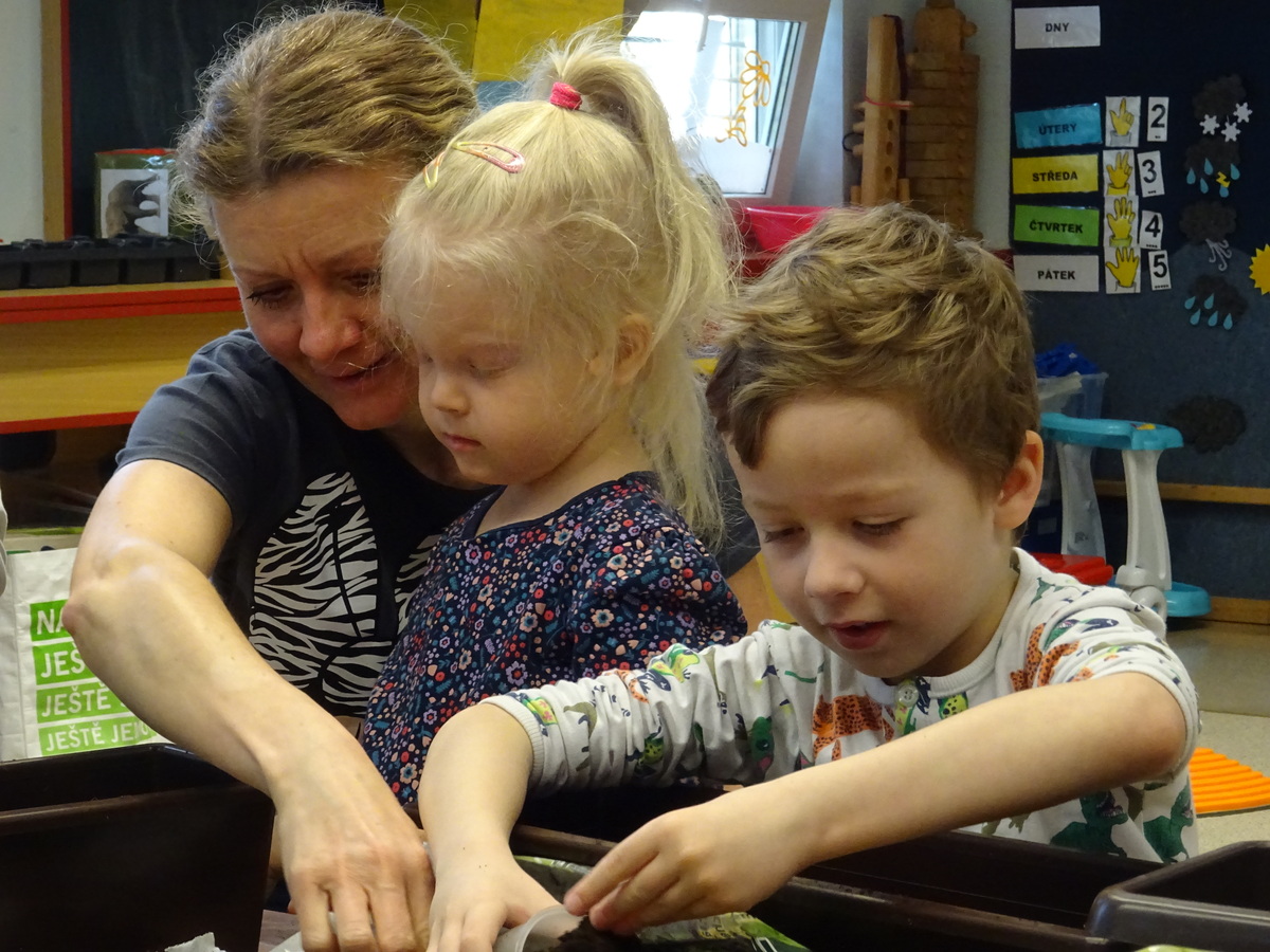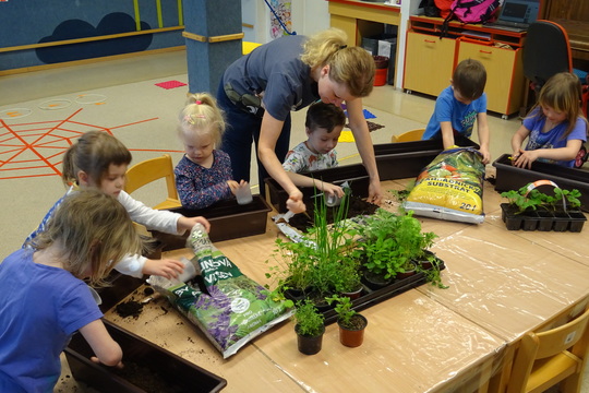 30. dubna slavíme "Pálení čarodějnic", ale ne všechny čarodějnice jsou zlé, a tak jsme si hráli na hodné čarodějnice, spíše na babky kořenářky. Vysadili jsme do truhlíků (do kterých si předem děti vyzkoušely vyvrtat díry na odtok vody) různé druhy bylinek. Rozvíjeli jsme čichové smysly a přiřazovali jsme podle vůně k sobě pytlíčky s kořením a bylinkami. A na závěr nesměla chybět oslava filipojakubské noci :)
