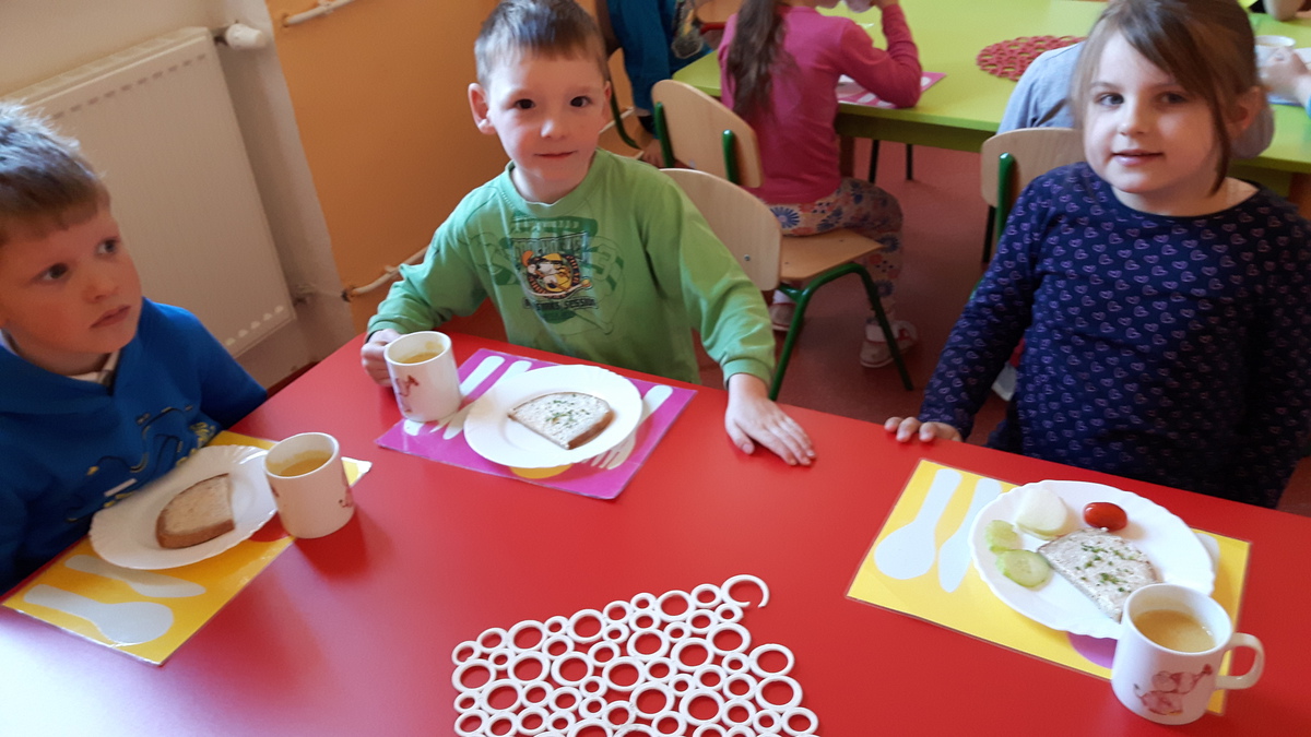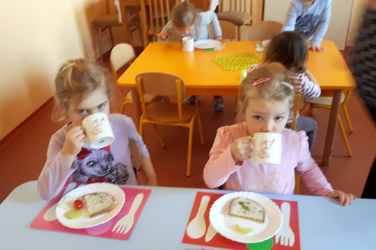 Paní kuchařka nám přichystala plnou mísu různého ovoce, především jablíček z naší zahrádky, pomerančů, mandarinek, kiwi, hroznového vína a dalších. Do připraveného odšťavňovače děti za pomoci pí. kuchařky a učitelek přidávaly ovoce a sledovaly, jak vytéká hustá šťáva. Vhazování nakrájeného ovoce do odšťavňovače se stalo obrovskou zábavou pro děti. Rozhodně nemusíte mít obavy přizvat si na pomoc vaše děti při výrobě vitamínového nápoje u vás doma :-). Tuto hustou šťávu jsme malinko zředili vodou a rozlily dětem do hrníčků, aby všechny děti mohly ochutnat. Dětem šťáva moc chutnala a přidávaly si, dokud se všechna nevypila. Zajímavé je, že šťávu konzumovaly všechny děti, kdyby to byly jen kousky ovoce, zdaleka ne všichni by je jedli. Pí. kuchařce Heleně, která nám pomohla s výrobou fresh šťávy chceme moc poděkovat :-) a už se těšíme na další čerstvou šťávu, tentokrát z melounu, který nám slíbila.