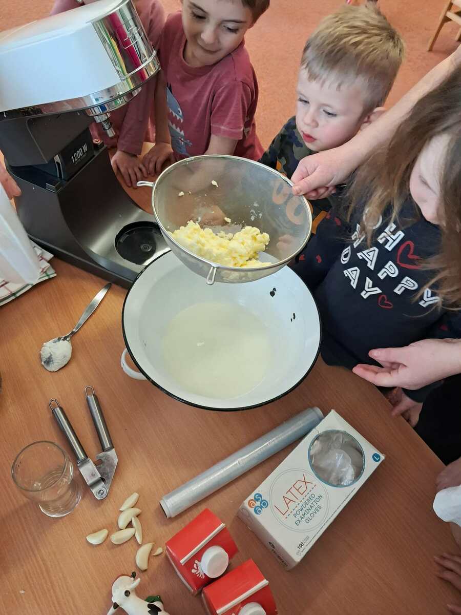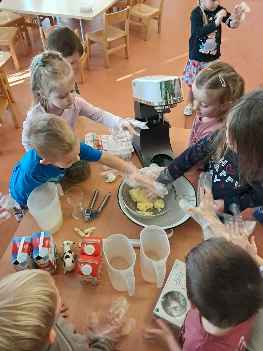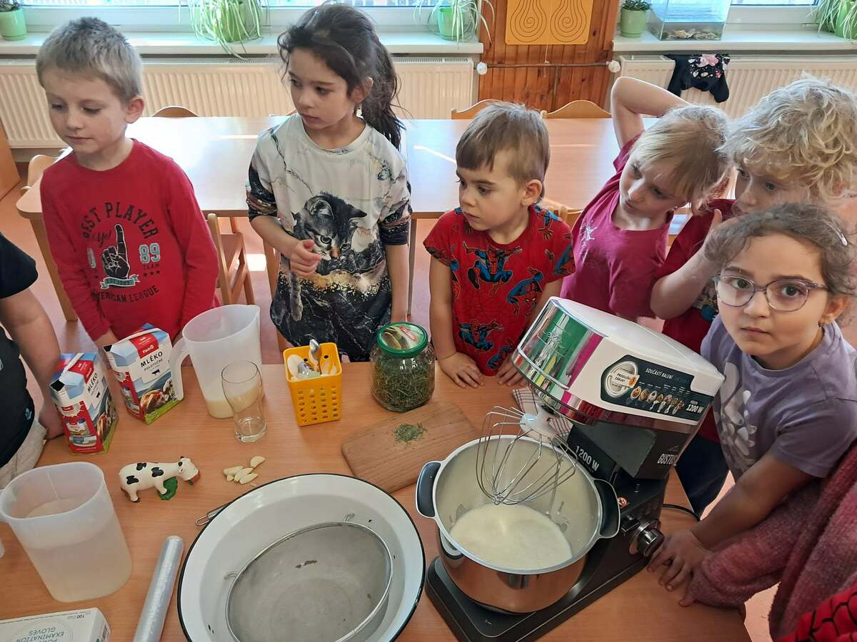 Cesta másla . Děti ve školce se dozvěděly, jak vzniká máslo. Nejprve kravička dává mléko , z mléka se oddělí smetana a ta se potom dlouho tluče, až vznikne máslo.Děti si povídaly, odkud jídlo pochází a jakou cestu musí urazit, než si ho dáme na chleba.