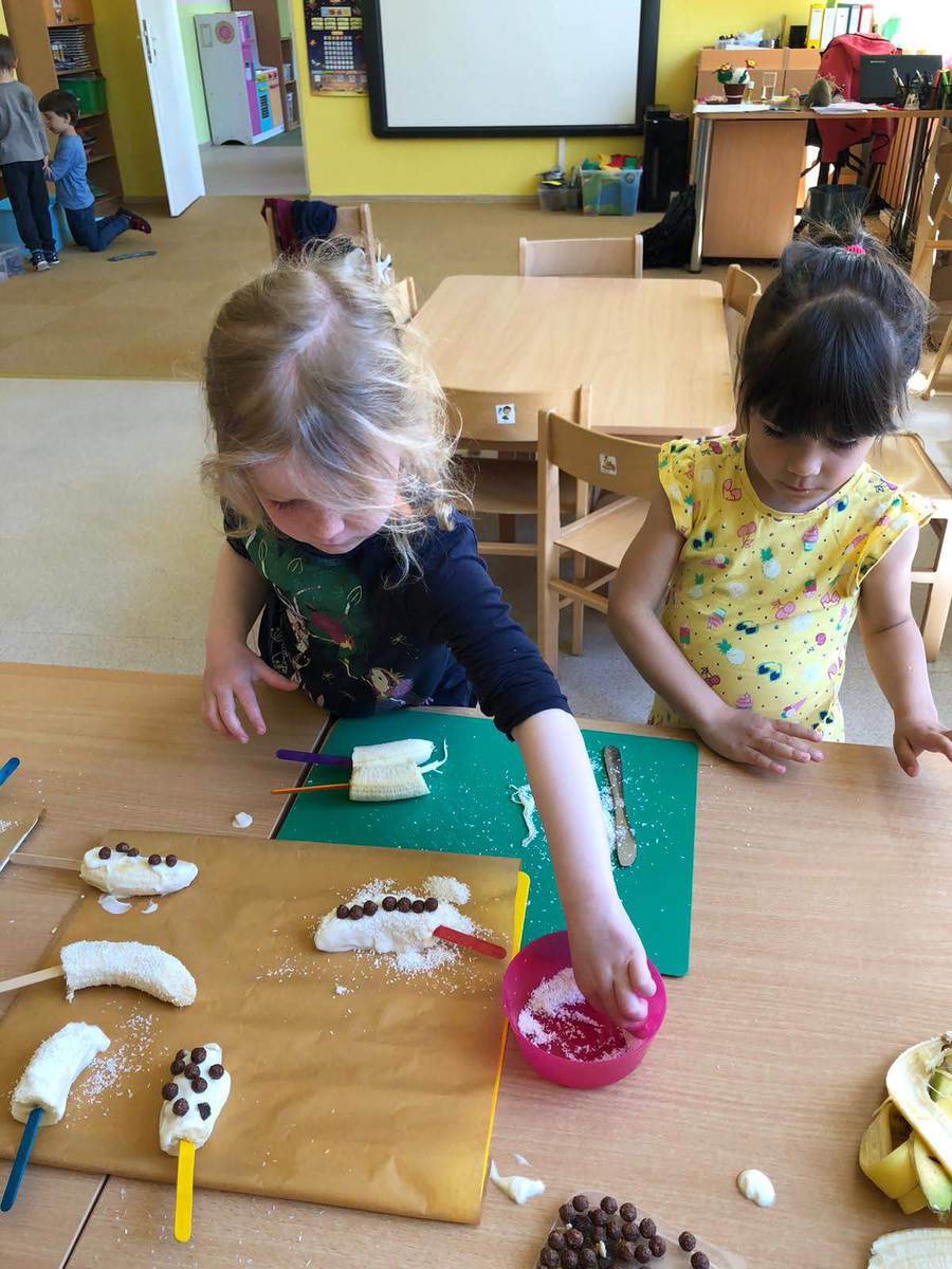 Cooking Club is back! after a long hiatus because of school closings and health concerns over the virus. Our first snack we made after such a long time was quite easy but very fun. We took bananas, cut them in two pieces, and stuck popsicle sticks inside the flat bottoms, carefully so not to break the bananas. After, we used two different types of yogurt, vanilla and baked apple, to cover the bananas. We laid the bananas on a pan covered with wax paper and proceeded to decorate the bananas with muesli, coconut flakes, seeds, and nuts. After the children took turns decorating their bananas, we put the pans into the freezer and waited about 2-3 hours before taking them out and enjoying our frozen snack. Yum! Enjoy these at home or at school on a hot, sunny day.