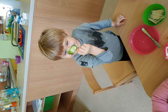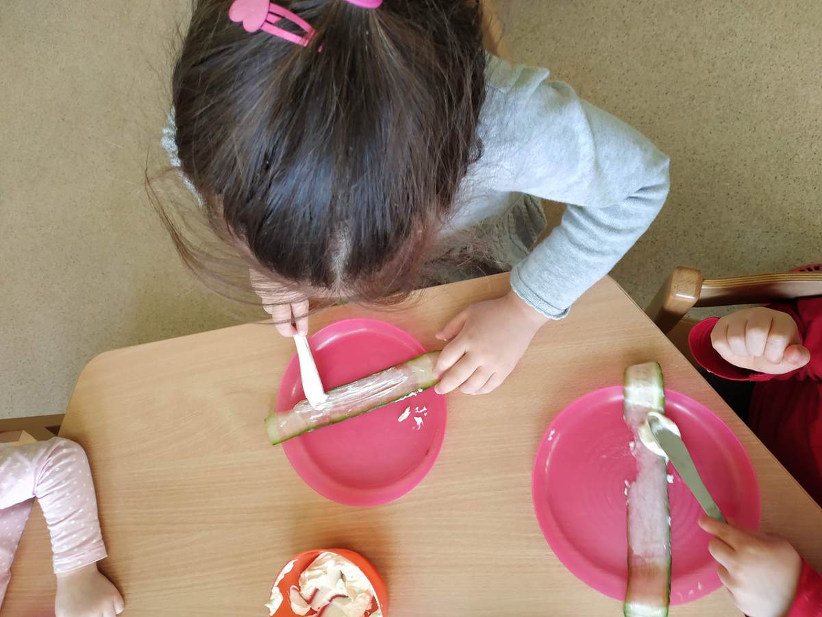 This week, the cooking club had to use lots of patience when dealing with the cucumber rolls. We started by washing the cucumber and peeling it width-wise to make long, wide pieces. We then combined fresh cheeses to make a nice spread. After we used the left-over cucumbers and cut those, along with red bell peppers, into small long pieces. With everything prepared, we began to assemble. We started with a long piece of cucumber, which we then spread on the cheese, placed a couple pieces of pepper and cucumber, seasoned with herbs, and rolled up and fixed in place with a toothpick. Yum!
