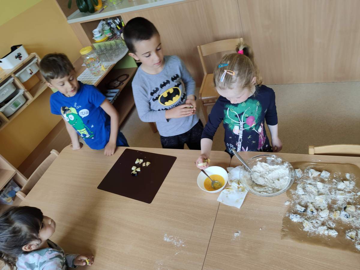 This week the Cooking club made something that not many of them were very interested in. When the eggplants were brought out on the table, each child could identify it in Czech and English, however almost everyone said they didn't like the taste of it. It was a bit harder to get them interested in something no one likes. However, we started by making a flour mixture composed of a half cup of parmesan cheese mixed with whole wheat flour and spices (salt, pepper, oregano). After that, someone cracked and whisked two eggs together, making sure they were well mixed. Once the children had cut up the eggplant into little cubes, we made an assembly line. We started by dropping the eggplant cubes in the egg mix, taking it out and dropping it in the flour mixture, shaking off the excess and dropping it on a baking paper. Once all the cubes were coated, we baked them in our tiny oven till brown and crispy. After taking them out, we mixed white yogurt with garlic powder and salt to make a yummy dipping sauce. Everyone tried one piece and their eyes changed. Most of the children, who said they didn't like eggplant, now did. Quite a successful snack!