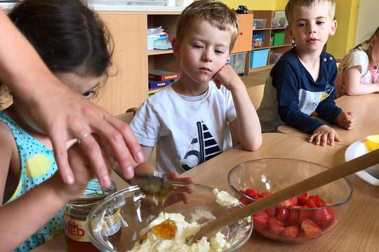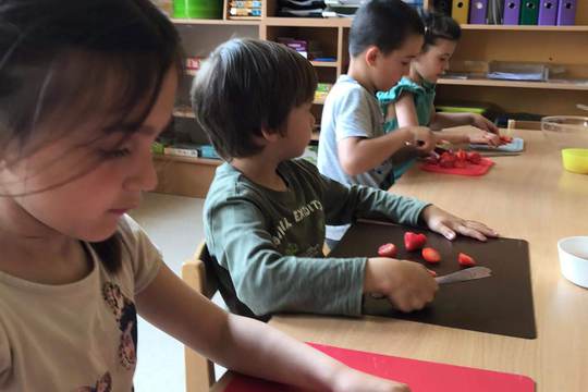 This week, the Cooking club made a very yummy dessert, no-bake cheese cake bites. We smashed whole-wheat biscuits till they were crumbs and combined it with melted coconut oil. Then we created the creamy middle, combining cream cheese, Greek yogurt, a hint of vanilla, and honey. The children had a hard time mixing it all together because of the clumpy cream cheese, so the teachers had to help. Once finished, the children had to prepare the strawberry topping in which they washed and cut off the top stems. Once everything was prepped, we assembled them together. Starting with the crumbs, we patted them into the bottom of the cupcake molds. Then we slathered on a bunch of the cream cheese mixture, and finished with strawberry decor. Finally, we put them in the freezer for a half hour, before removing them to devour! YUMMMM!!