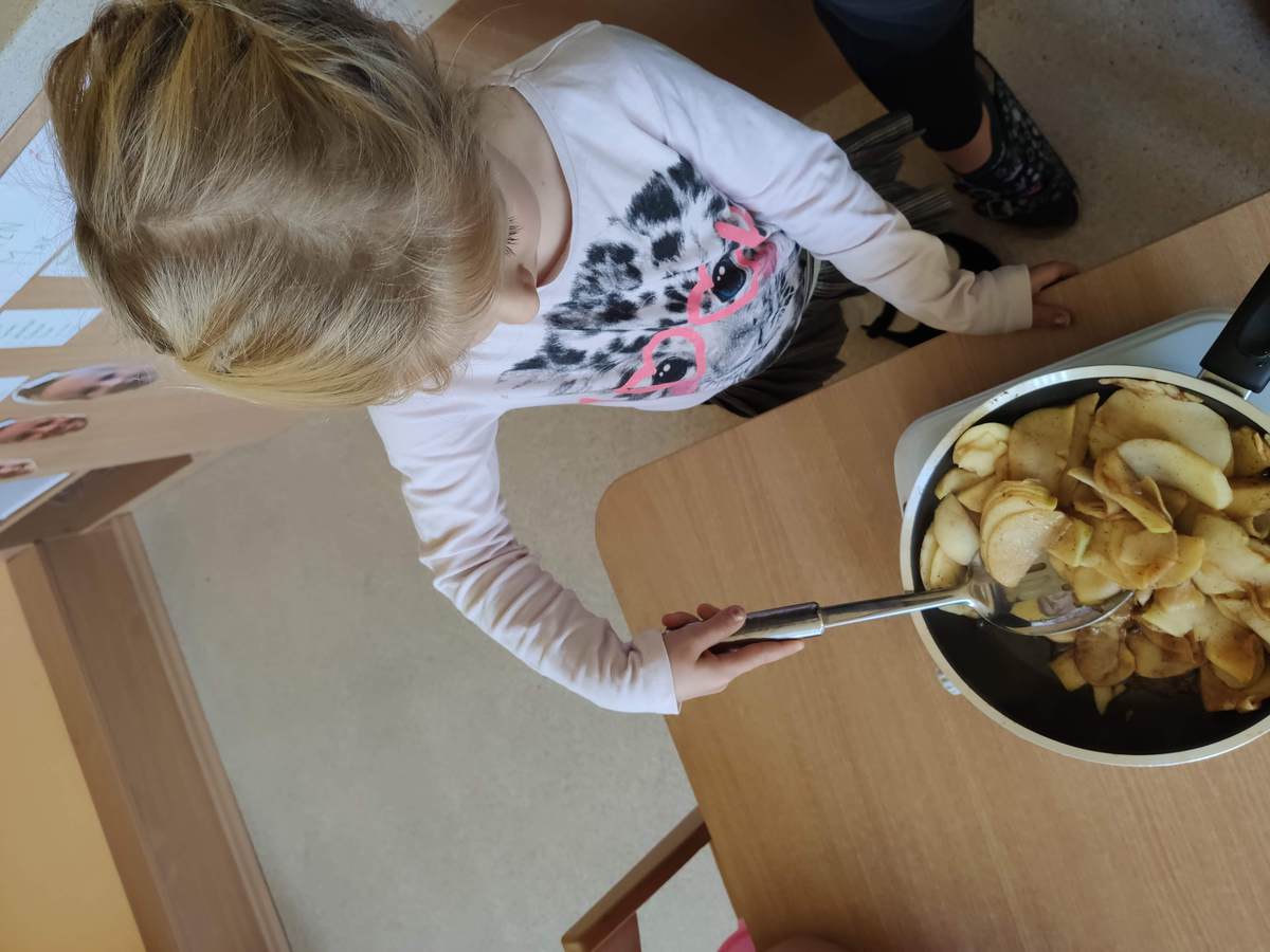 This week, the Cooking club made something with the in season fuit - apples! We made a no-bake apple crumble! The teacher prepared the thinly sliced apples and then the children carefully added them to our pan on the hotplate and mixed it with maple syrup and cinnamon. We let the cook while we prepared the crust, stiring it occasionally. The crust was made up of almond and coconut flour, a dash of salt, and then mixed with more maple syrup, olive oil, and a dash of vanilla. Once we started mixing, it became more and more crumbly. So we patted most of it into our pan, layered the apples on top, and sprinkled the last bits of the mixture on top like a crumble. We left it in the fridge overnight to eat for snack the next day. Yum!