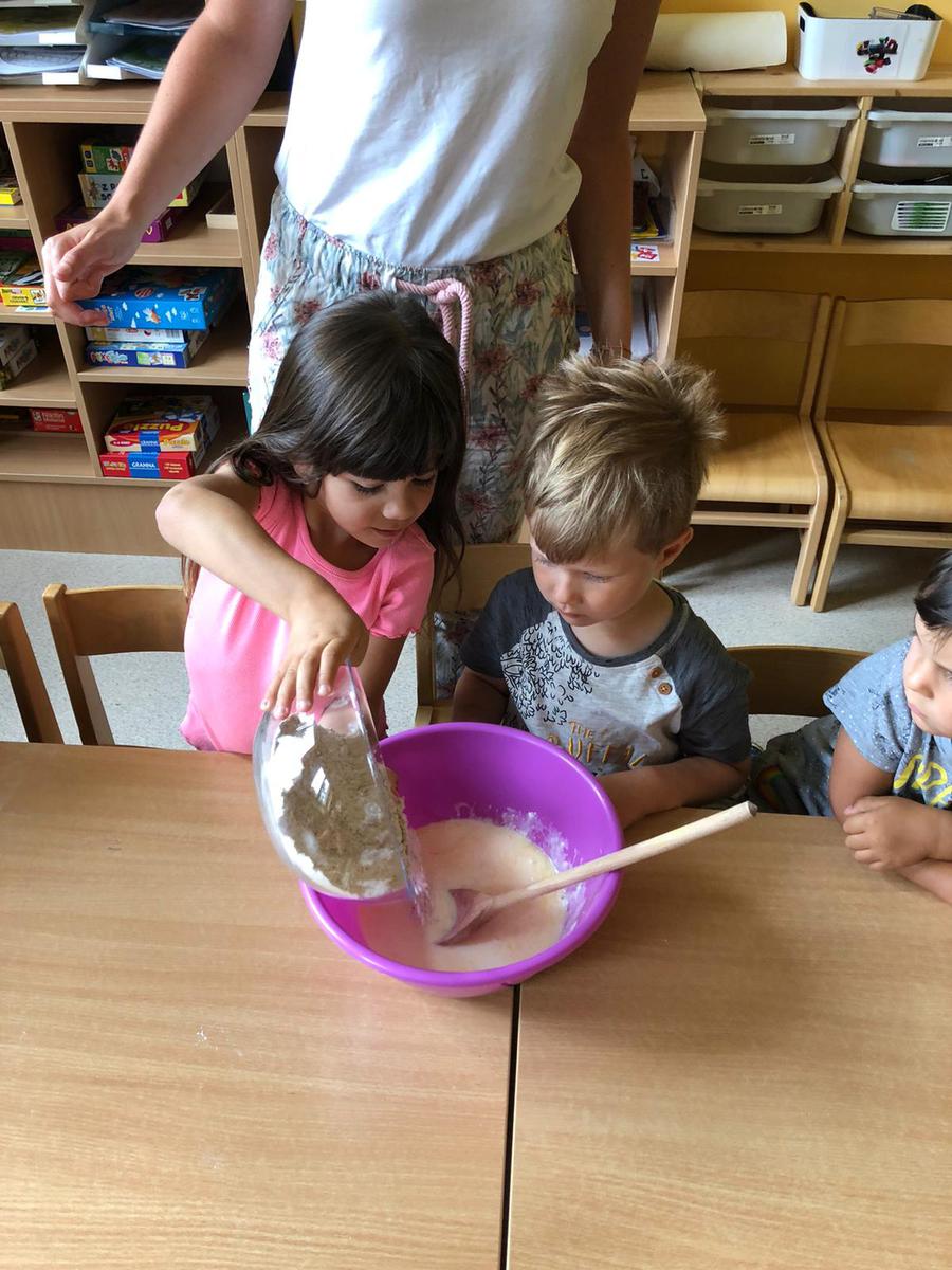 This week, the cooking club made some delicious waffles! Everyone was very excited to get started and we were happy someone lent us a waffle machine. We hope we can use it later for more yummy snacks. We started out lesson by identifying the ingredients, sniffing some, and measuring out the correct amounts. We mixed whole wheat flour, baking powder, and a little bit of pepper together in one bowl. And then we mixed the wet ingredients in another: melted butter, eggs, and buttermilk. After, we combined them together and mixed in some parmesan cheese. Then we heated up the waffle griddle and started cooking! The children had fun measuring out the ladles of batter and putting them in the griddle. Once the waffles were cooked (the children were very impatient), we let them put on a bit of butter or cream cheese as toppings. We had neither batter nor waffles left by the end, and all children had happy smiles on their faces. Next time, we'll try some sweeter ones.