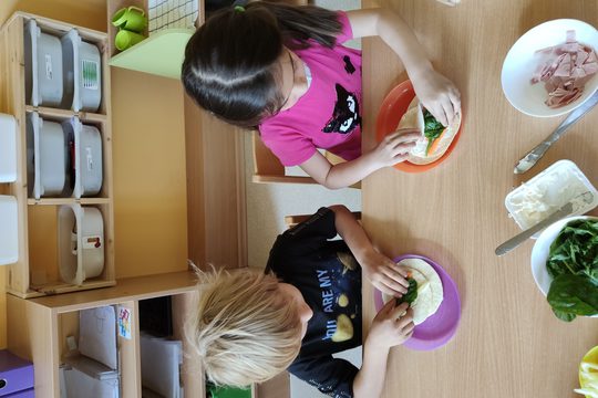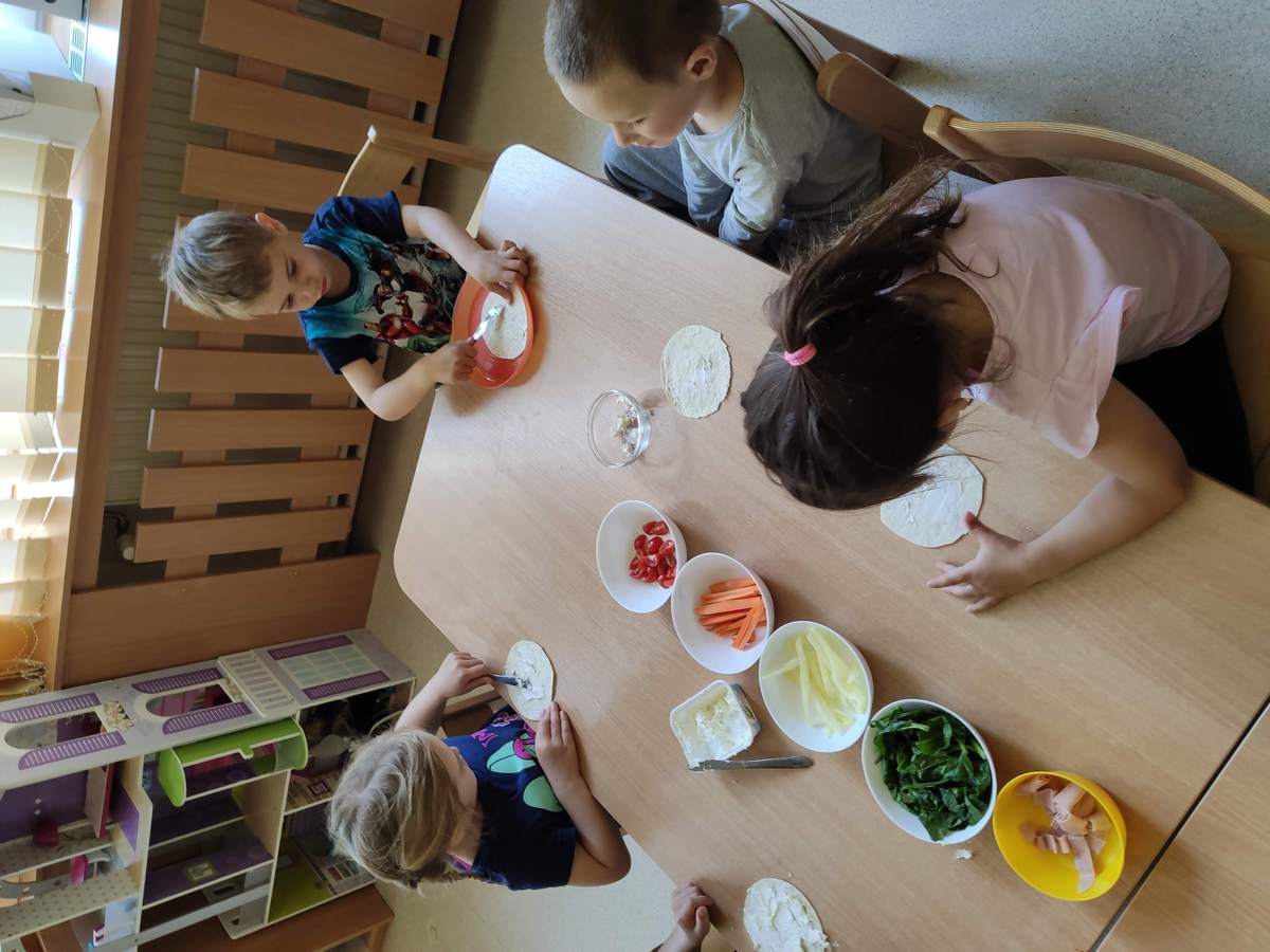 This week, the Cooking club made soft shell tacos. Originally, it was just supposed to be veggie tacos. However, we added ham to the mix after discovering that the children insisted on including it. We used quite a rainbow assortment of vegetables: cherry tomatoes, carrots, white peppers, and spinach. All we were missing was some purple cabbage. The children took mini tortillas and spread a small about of cream cheese or mustard on it so that the veggies could have something to stick to. Then, they were free to choose what ingredients they wanted to add to their tacos. All the veggies were cut in thin strips so they would fold nicely. As you can see from the pictures, the children were very creative. The older group made a few more for their parents, but each child was allowed to snack right then and there. To complete the tacos, the children were given a variety of spices to choose from but they decided against it. After, they rolled the tacos and stuck them with toothpicks in order to eat them without such a mess. Each child ate their taco with such fervor and then demanded more, so it was a pretty successful snack. See you next week! :)