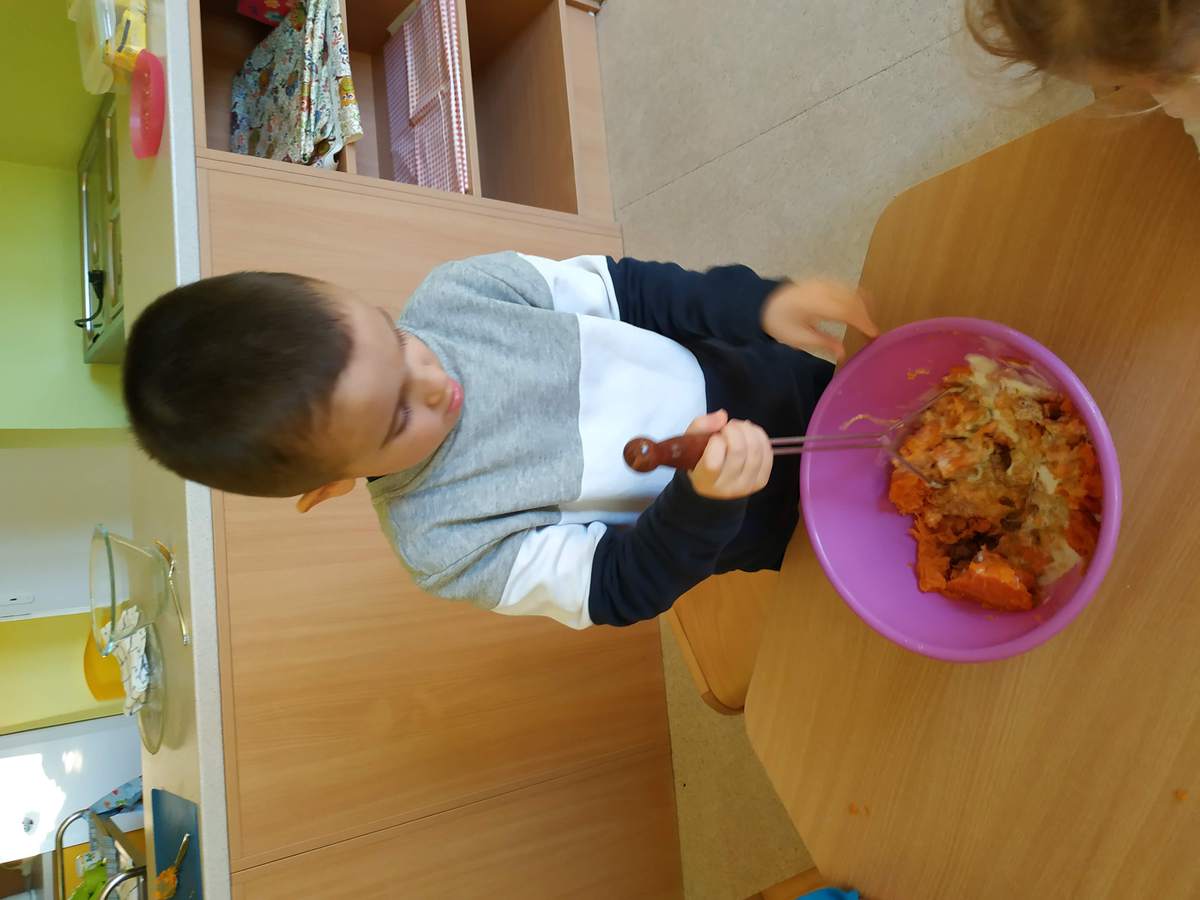 Looking at a sweet potato, the children guessed that it was a pumpkin, a carrot, or something strange. When they were given a chance to try it, the children refused. However, once they started to mash it, they had lots of fun and helped each other. After combining the masshed sweet potato with coconut milk, maple syrup, cinnamon, and sea salt, the children used their arm muscles to mix it well. We layered the mash with a variety of chopped nuts and drizzles of maple syrup. The second tasting went very well, they even asked for seconds.