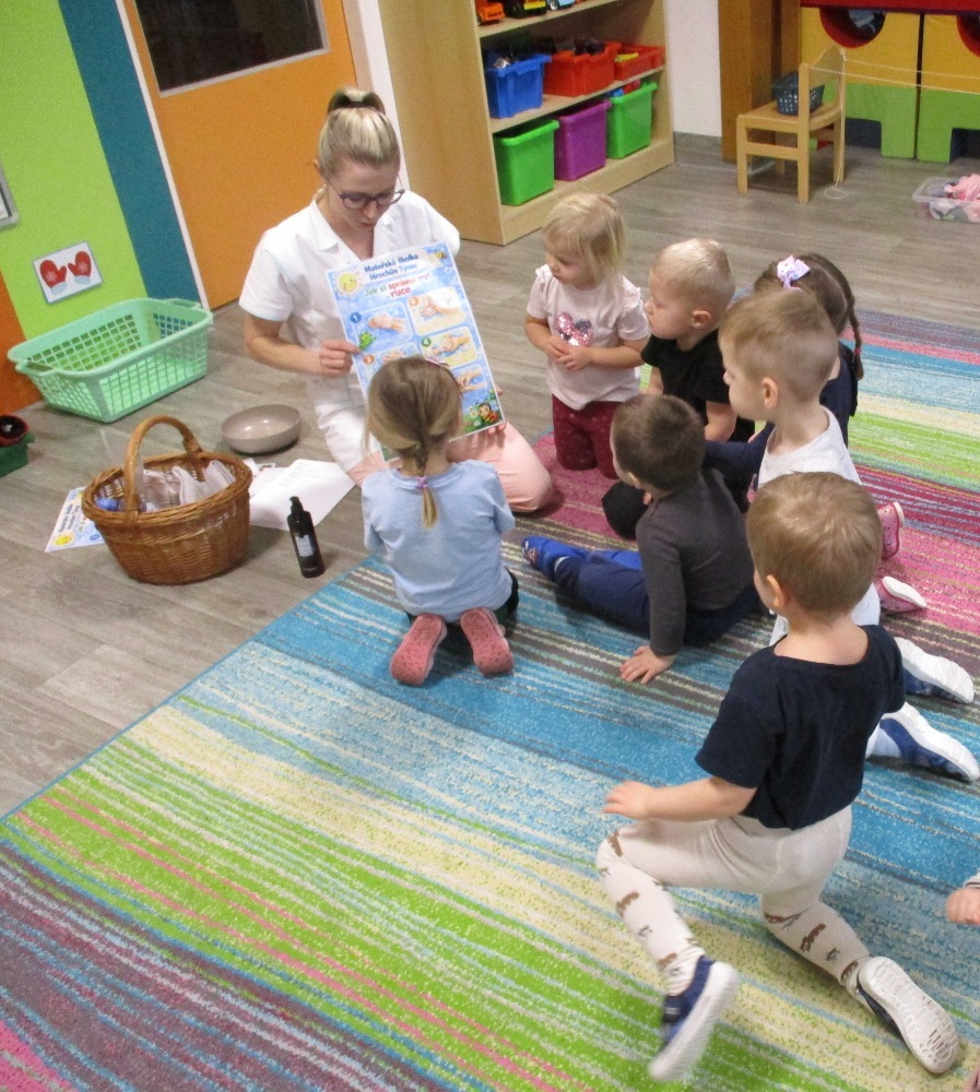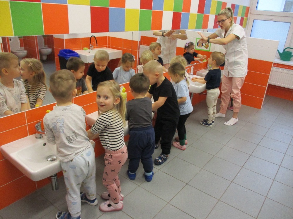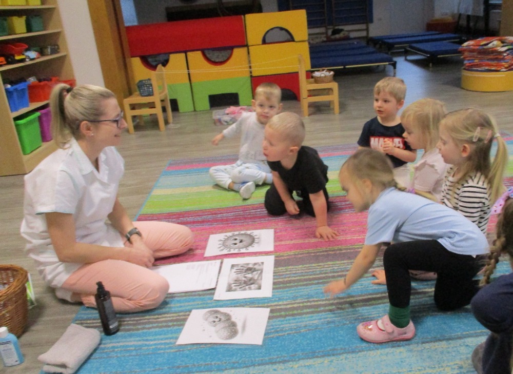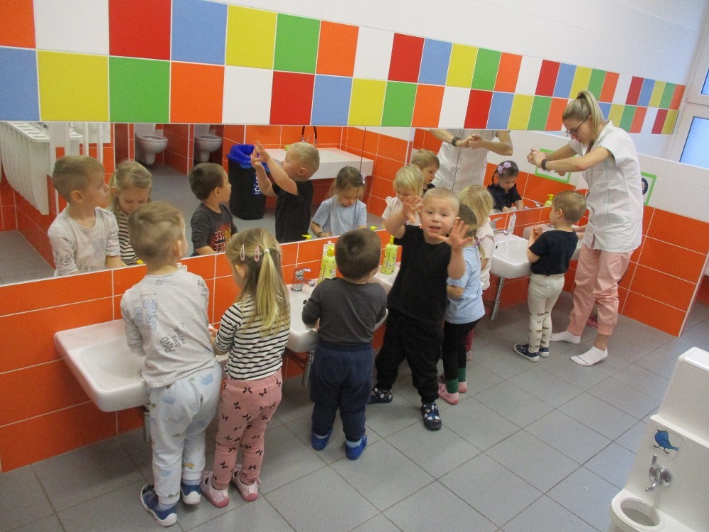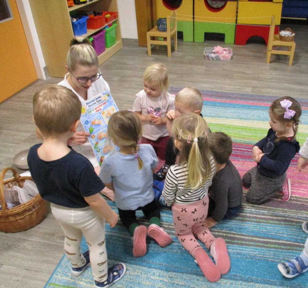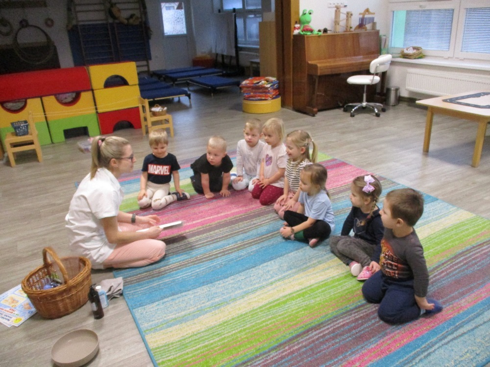 Dnes do naší mateřské školy zavítala maminka jednoho z dětí, která pracuje jako zdravotní sestra. Dětem poutavou a veselou formou přiblížila téma hygieny rukou jako důležité součásti péče o zdraví. Prostřednictvím vyprávění veselého příběhu o hodných a zlých bacilech dětem vysvětlila, proč je důležité mít čisté ruce a kdy si je správně mýt. Následoval hravý nácvik mytí rukou, při kterém si děti prakticky vyzkoušely správný postup. Na závěr byly děti motivovány k pravidelnému mytí rukou pomocí jednoduché básničky, která jim pomůže na hygienu nezapomínat.