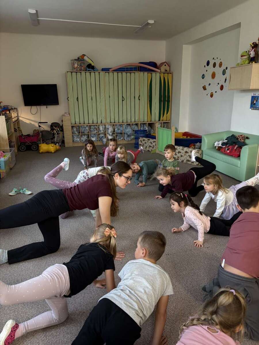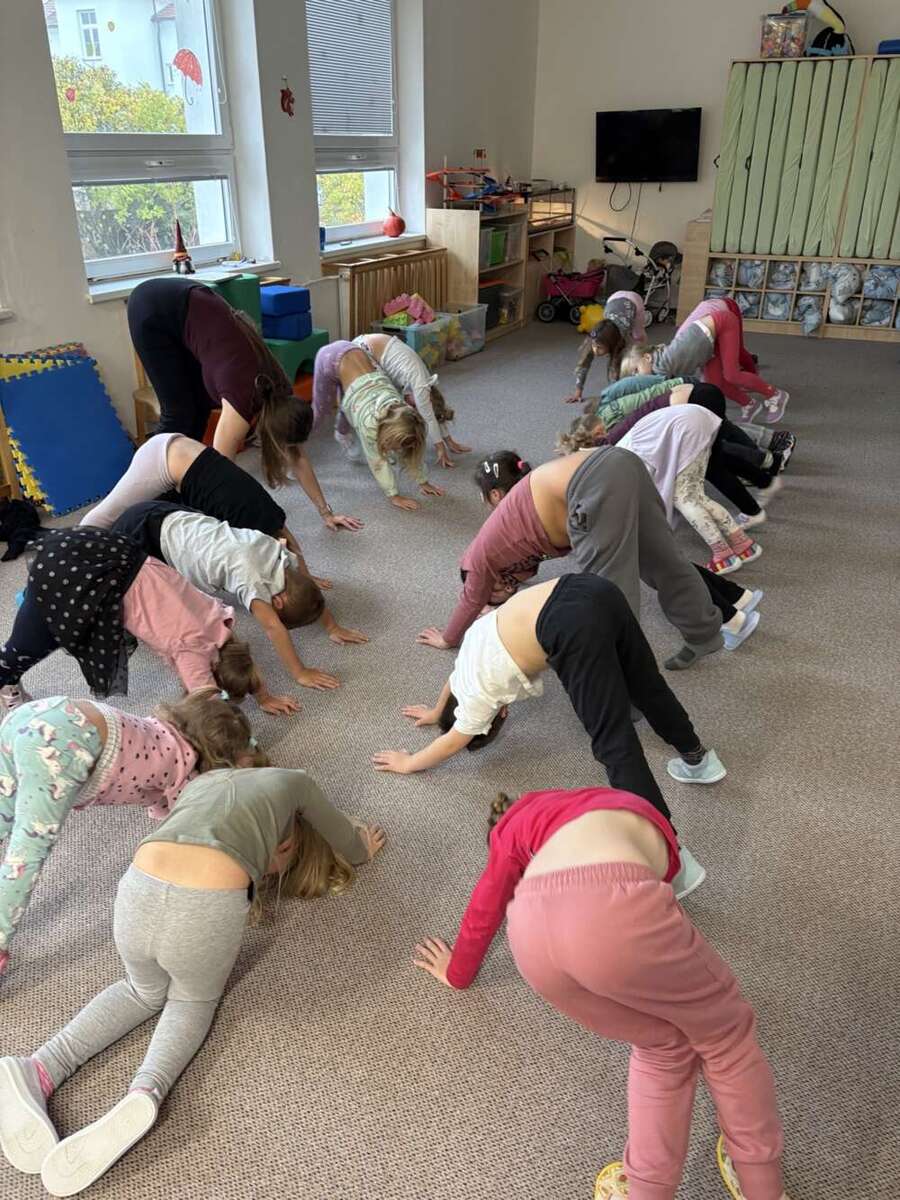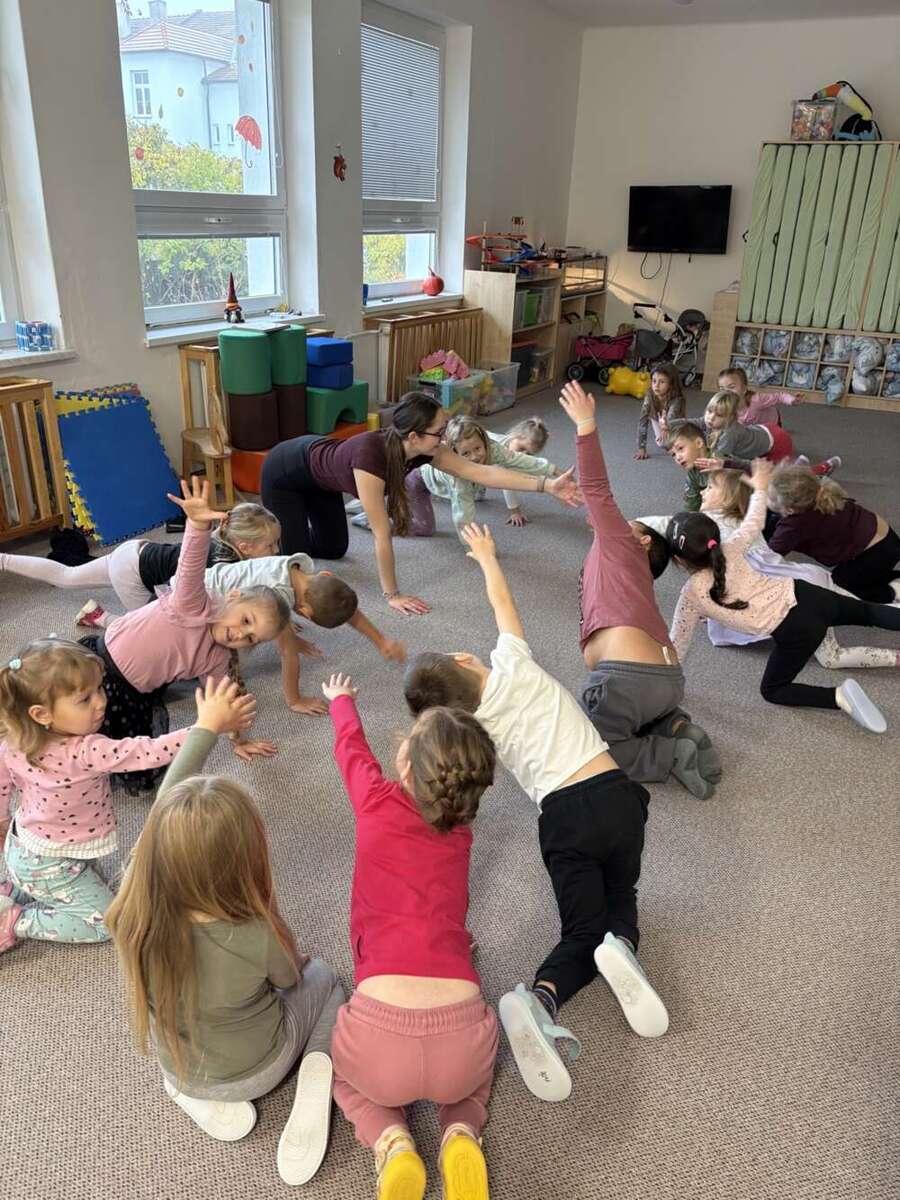 Ráno jsme tvořili věnce pro maminky a pak jsme si šli protáhnout tělo, nejprve jogové protažení a pak už pořádné řádění v tělocvičně. Pohyb je naší součástí, je pro nás uvolněním energie a hlavně už všichni víme, že je velmi dobrý pro náš vývoj.