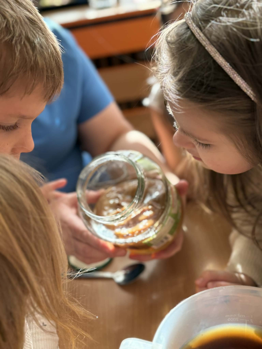 Společně jsme uvařili čaj, pečlivě odměřili cukr (ano, i zdravé věci si občas rády pochutnají na sladkém) a když čaj vychladl, přišel slavnostní okamžik! Napjatě jsme sledovali, jak se kombucha pomalu usazuje na hladině v zavařovací sklenici, kterou jsme přikryli plátýnkem, aby měla klid na svou bublinkovou práci.