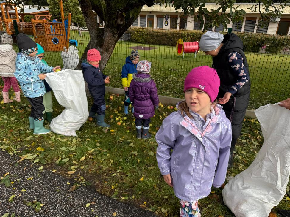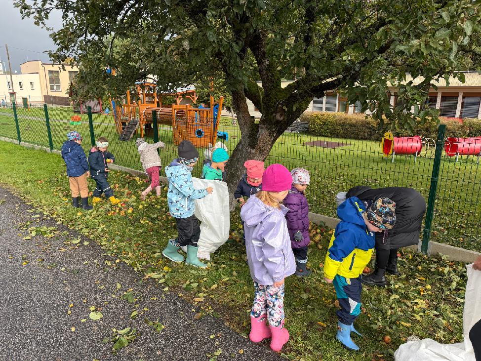 Děti se vydaly na zahradu, kde jsme společně sklidili úrodu voňavých jablíček. Každé jsme prohlídli, některá putovala do lesa pro zvířátka a ty krásná do pytle. Nasbíraná jablíčka jsme odvezli do moštárny, kde nám vyrobili mošt bez cukru a konzervantů. Je to krásná ukázka jak se ze společné práce stane něco, co si děti mohou vychutnat.