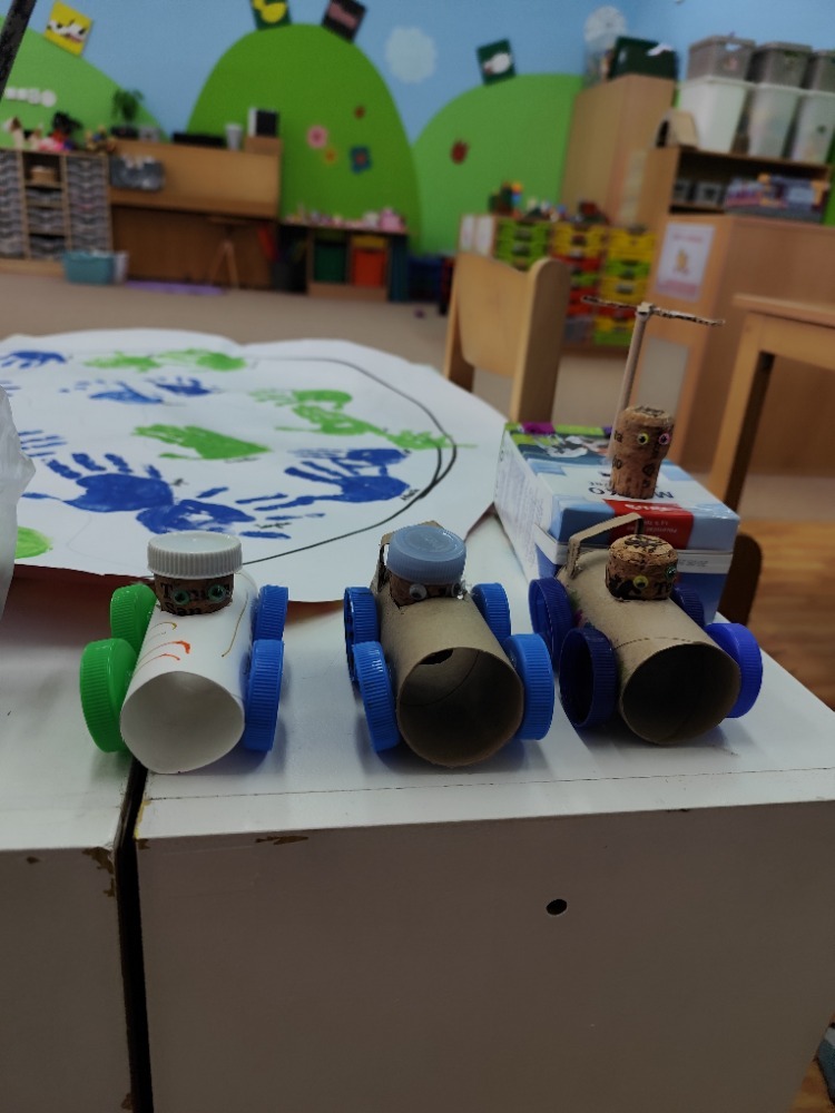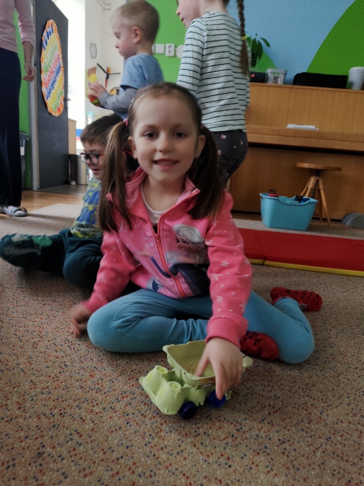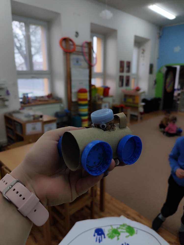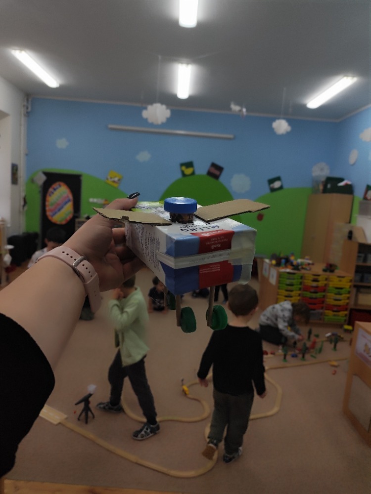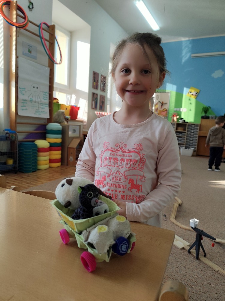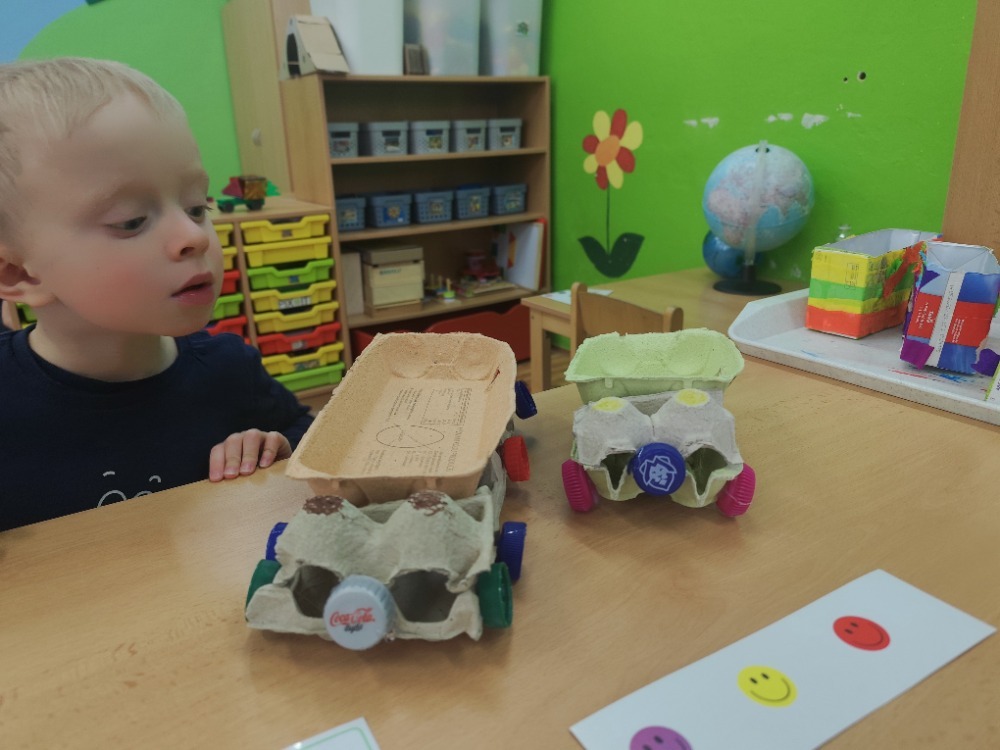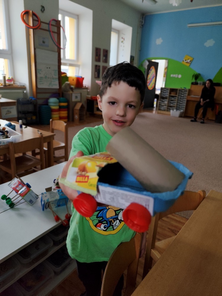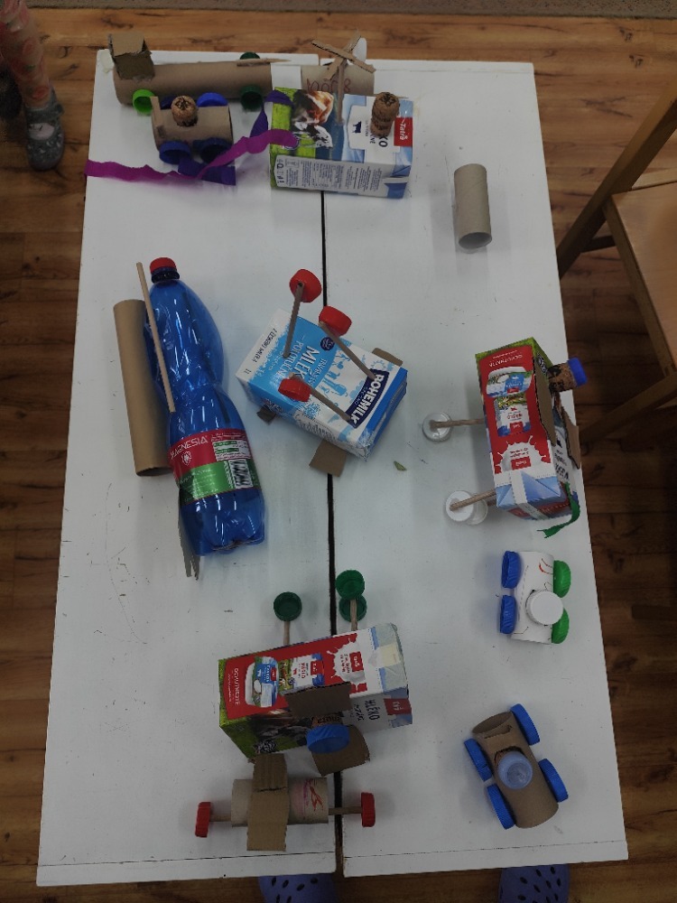 Místo nových materiálů jsme sáhli po ntom, co už by jinak skončilo v koši. Děti pracovaly s kartonovými krabicemi od mléka, ruličkami od toaletního papíru, platy od vajíček nebo korkové špunty. Z těchto zdánlivě nepotřebných věcí vznikaly nápadité dopravní prostředky - vrtulníky, letadla i závodní formule.