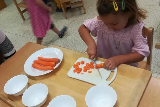 S dětmi jsme si povídali o tom, jaké ovoce a zeleninu znají, jaké rády jedí. Pojmenovávali jsme různé druhy ovoce a zeleniny. K poznávaní jsme využili vesměs všechny smysly - pozorovali jsme očičkama, ohmatávali, užívali si vůni a samozřejmě ochutnávali.