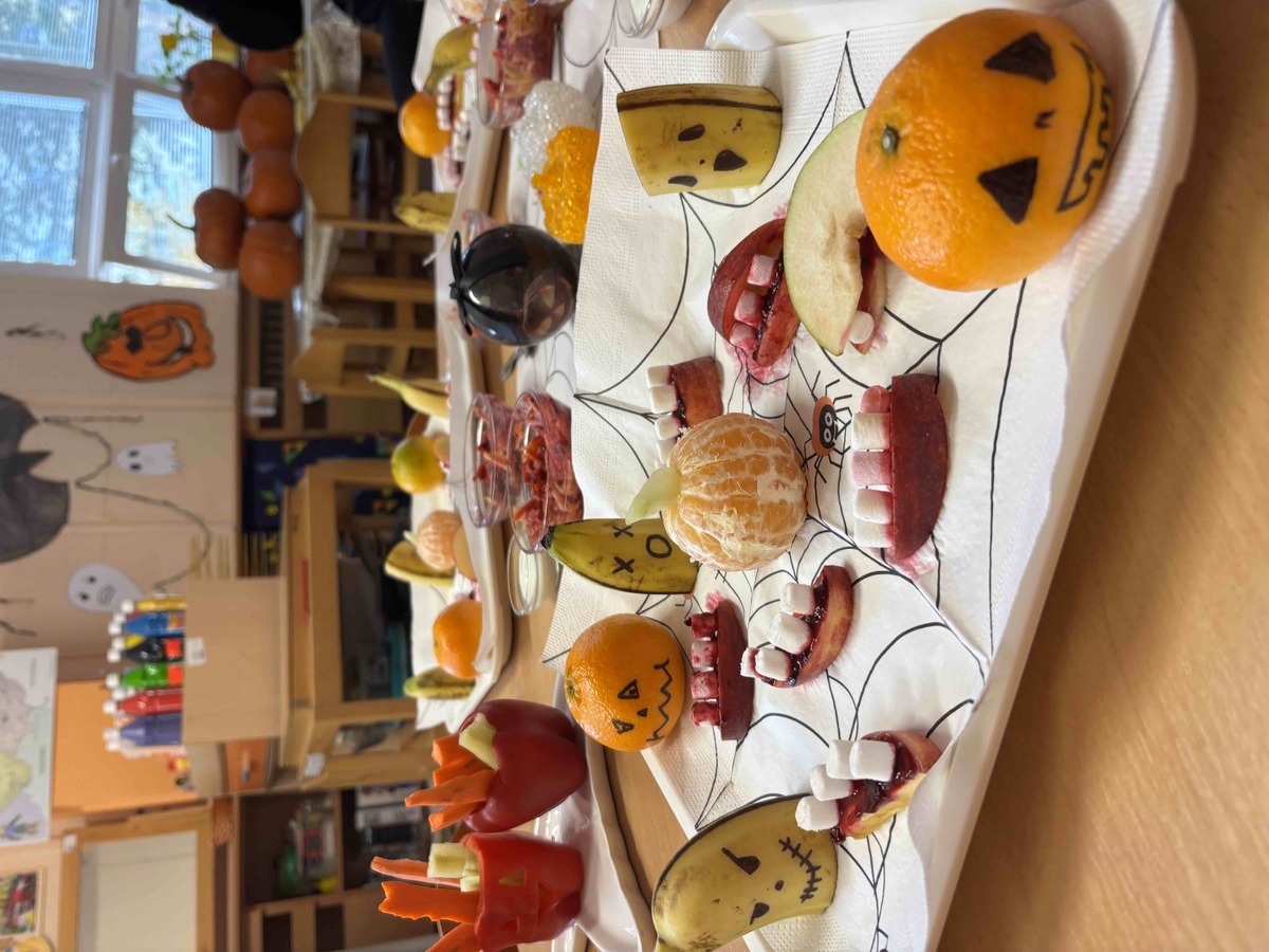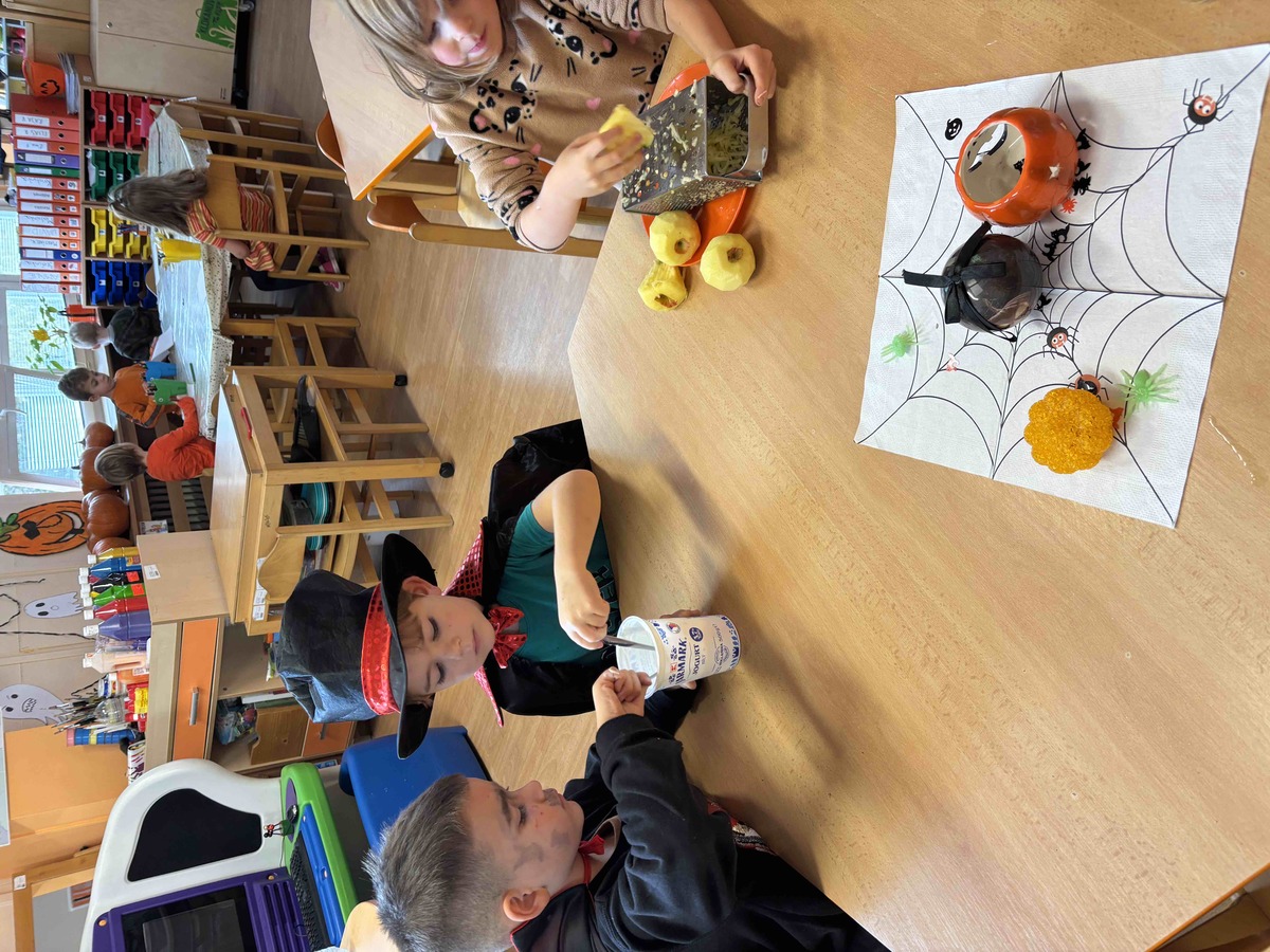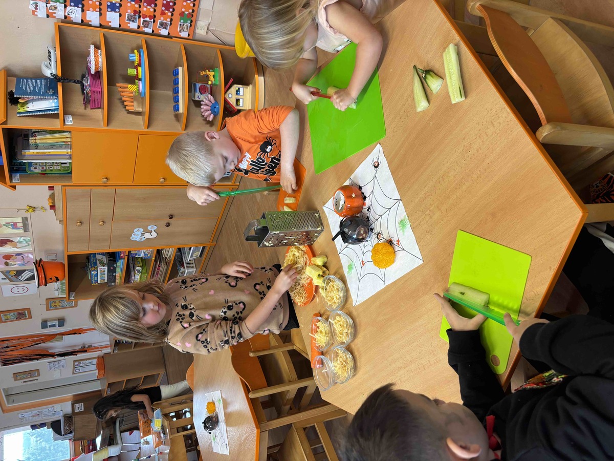 Děti si dnes 4.11.2025 na dýňovou slavnost připravily vlastní halloweenské občerstvení. Krájely, strouhaly, zdobily a aranžovaly talíře jako malí kuchaři. K tomu si vyrobily jednoduchý dip z jogurtu, oregana, česneku a špetky soli. Společná příprava je moc bavila a na závěr si své „strašidelné dobroty“ společně vychutnaly. ????????