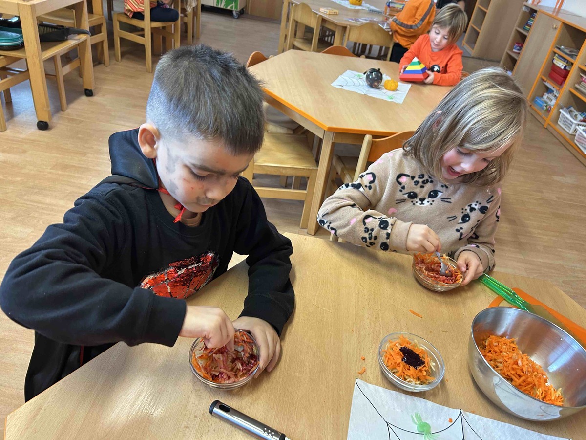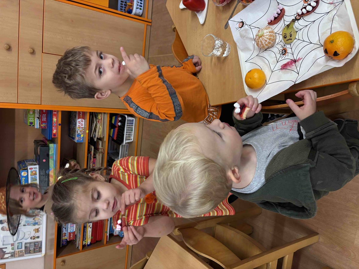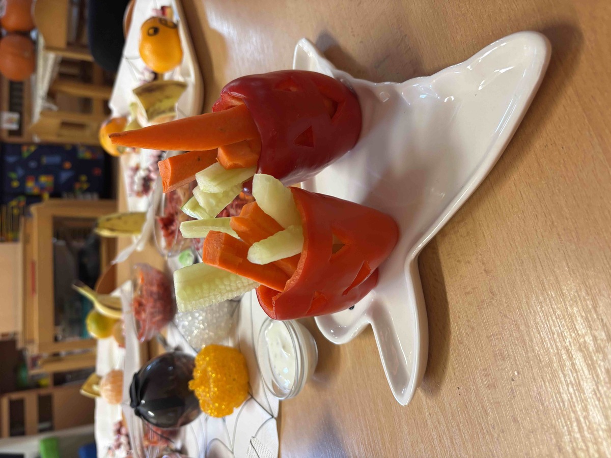 Děti si dnes 4.11.2025 na dýňovou slavnost připravily vlastní halloweenské občerstvení. Krájely, strouhaly, zdobily a aranžovaly talíře jako malí kuchaři. K tomu si vyrobily jednoduchý dip z jogurtu, oregana, česneku a špetky soli. Společná příprava je moc bavila a na závěr si své „strašidelné dobroty“ společně vychutnaly. ????????