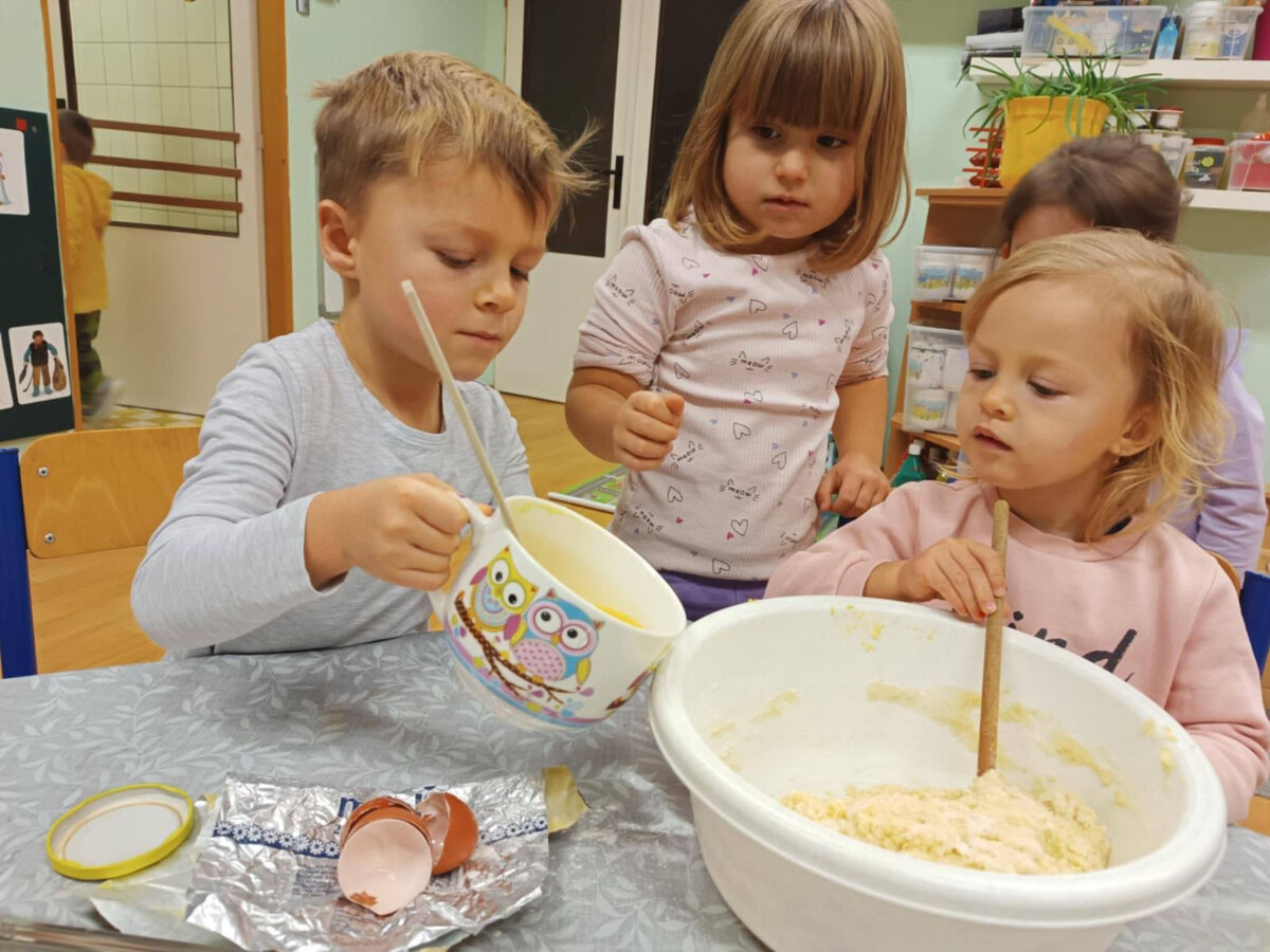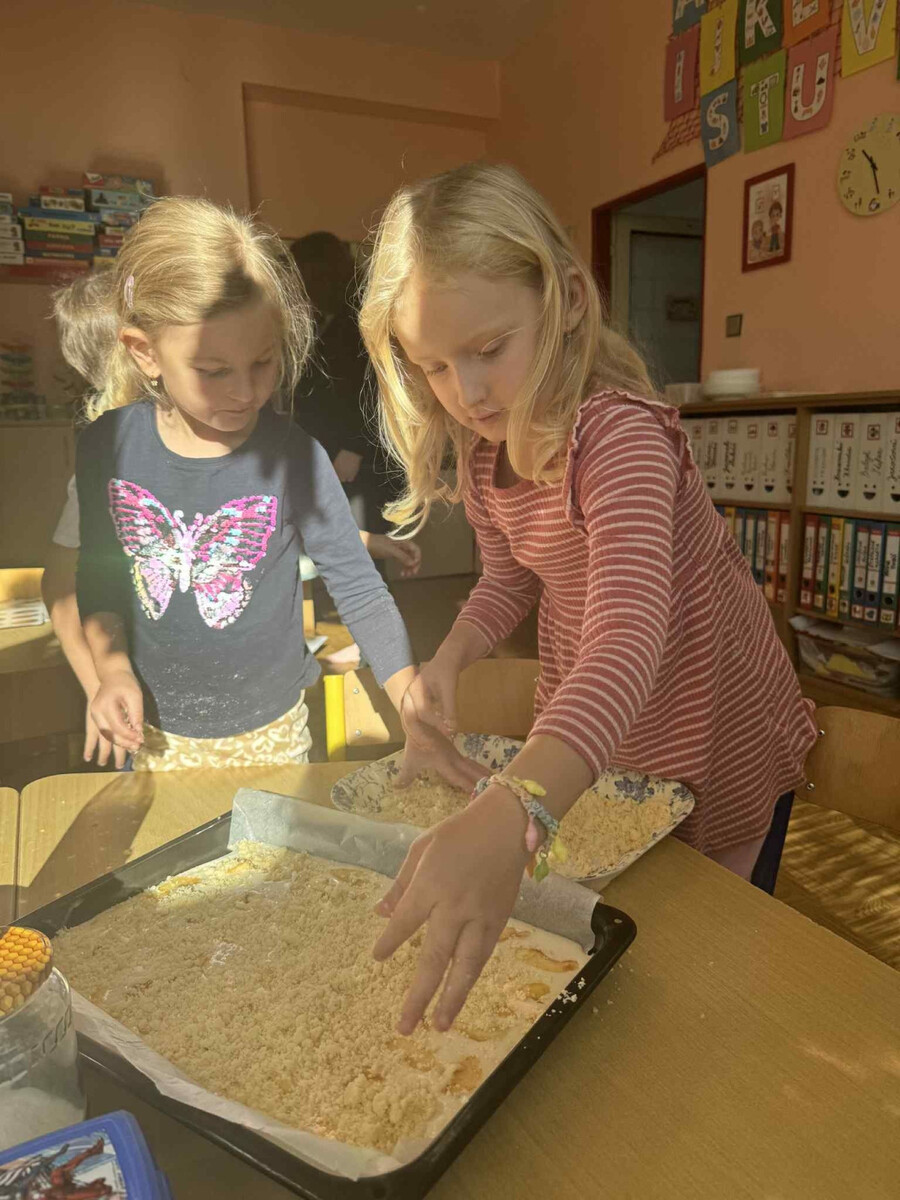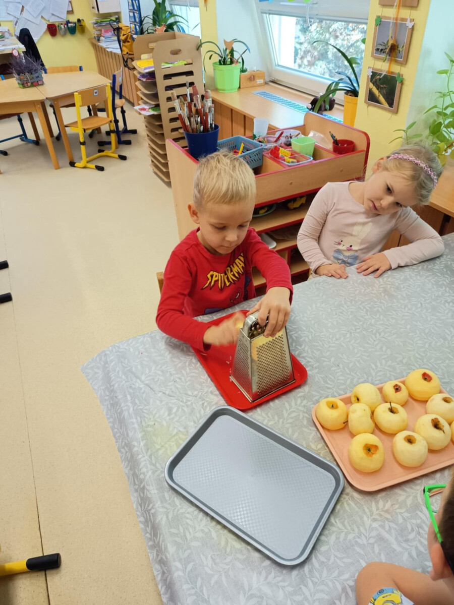 Děti vyráběly z pedagogy různé dobroty z jablíček. Také sušily jablíčka-křížaly. Děti rády připravují suroviny na pečení. A ještě raději ochutnávají výsledek své práce.