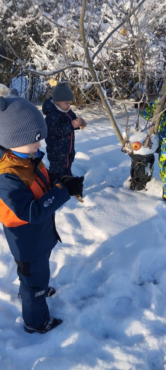 Děti se učily o ptačcích: nejprve si je nakreslily, pak si na ně zahrály, vyrobily jim něco dobrého k snědku, a nakonec jim dobrůtky rozvěsily na strom.
