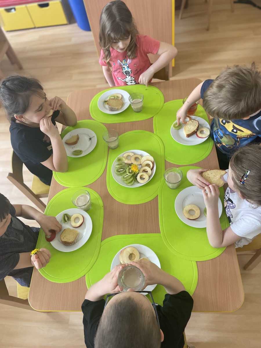 Co to voní z kuchyně, volaly děti po odpočinku a nedočkavě vyhlížely naši kuchařku Blaničku. Ta jim donesla vláčnou bábovku, která byla nazdobená pampeliškami. Děti si pak samy dozdobily talířek ovocem a před odchodem domů nabídly bábovku na ochutnání i rodičům.A pampelišky? Tak ty nezbyly a dětem moc chutnaly.