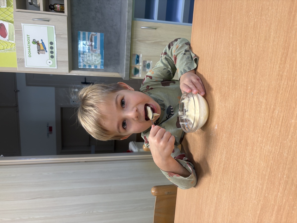 Naše paní kuchařky dnes pro děti připravily zdravou svačinku – jablíčkovou přesnídávku z našich vlastních jablíček a bio tvarohu.
