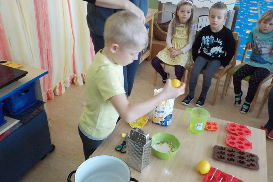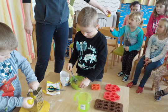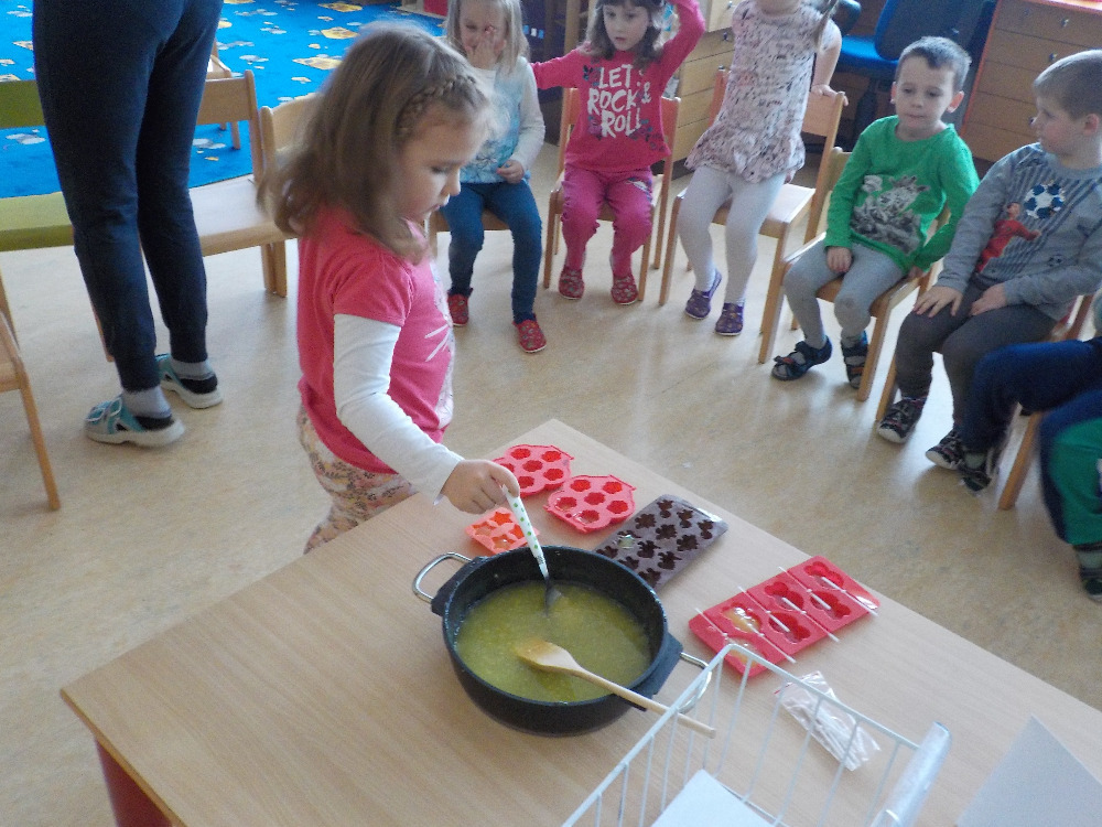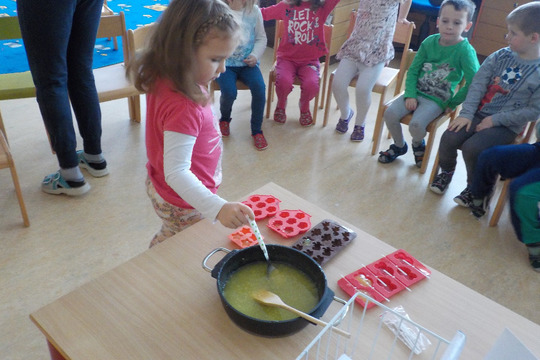 No a co je lepšího na mlsání než zdravá domácí zmrzlina? Děti odměřovaly, přelévaly, vážily, strouhaly, míchaly, vařily a plnily formy. Také trénovaly svoji trpělivost, protože na konečný výsledek si musely počkat až do druhého dne, než zmrzlina v mrazáku zmrzla. To si ji po dobrém obědě od našich paní kuchařek náležitě vychutnaly.