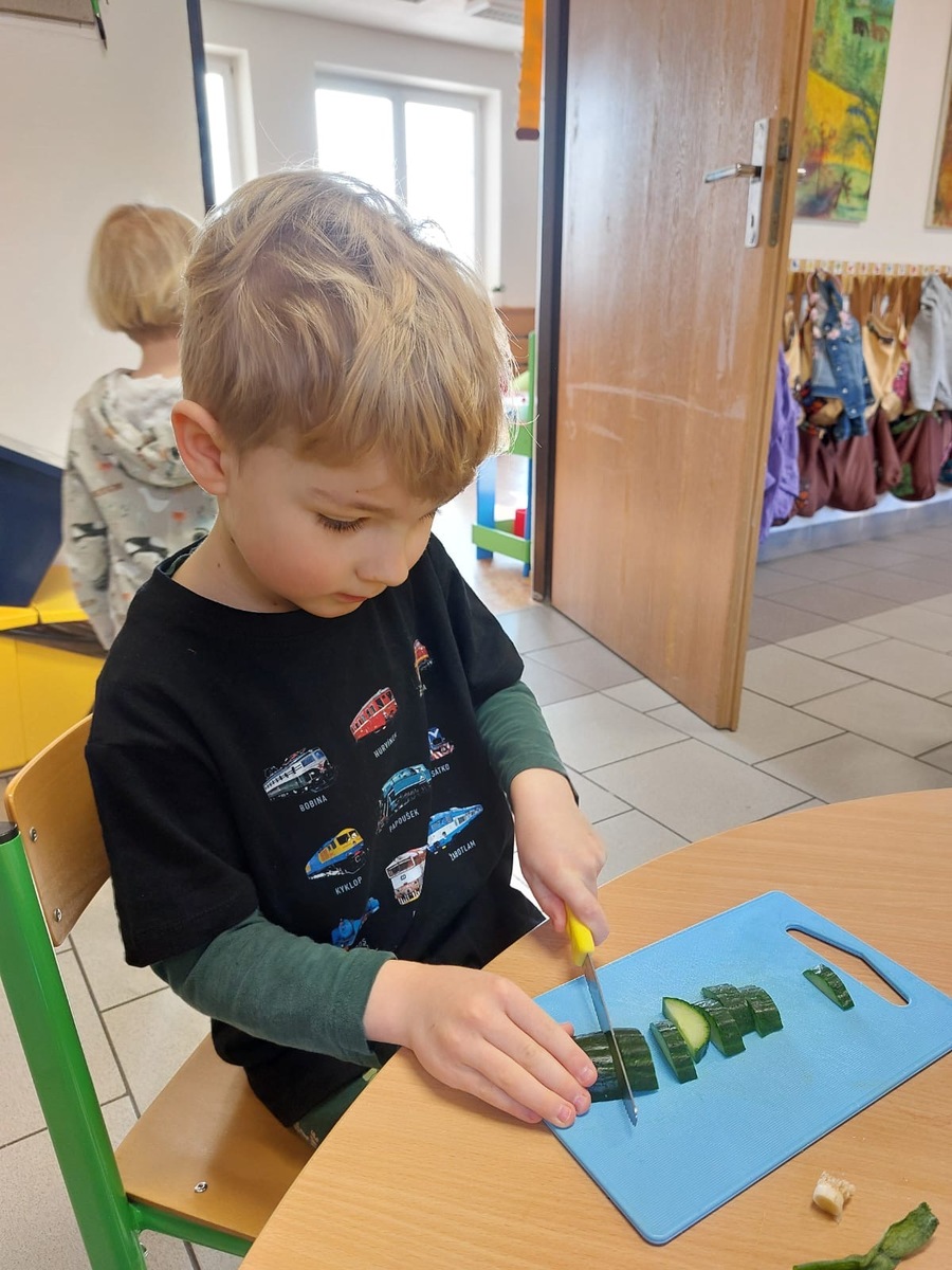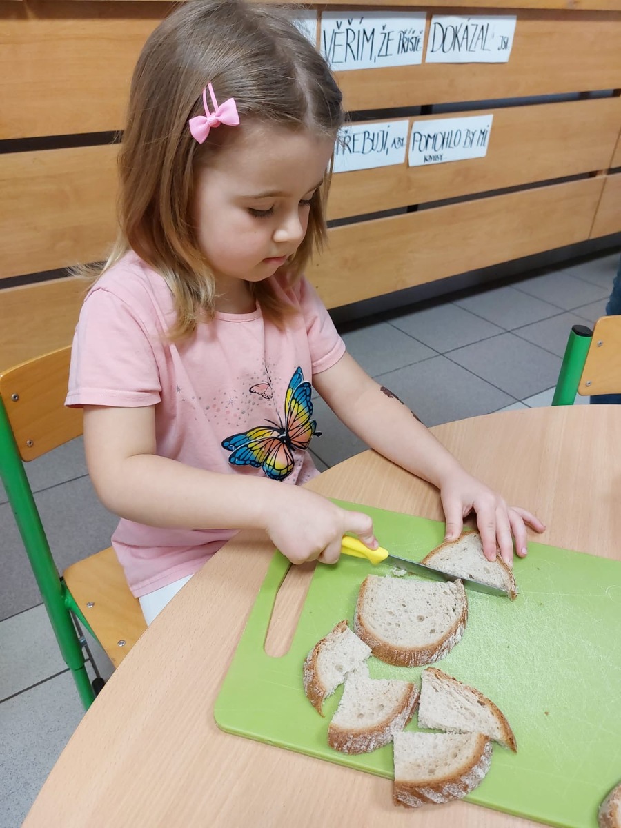 Když si děti jídlo samy připraví, chutná jim dvojnásob! Tentokrát jsme se společně pustili do přípravy dopolední svačinky. Práce bylo dost pro každého. Děti se s nadšením zapojily do všech fází přípravy, od mytí až po servírování.