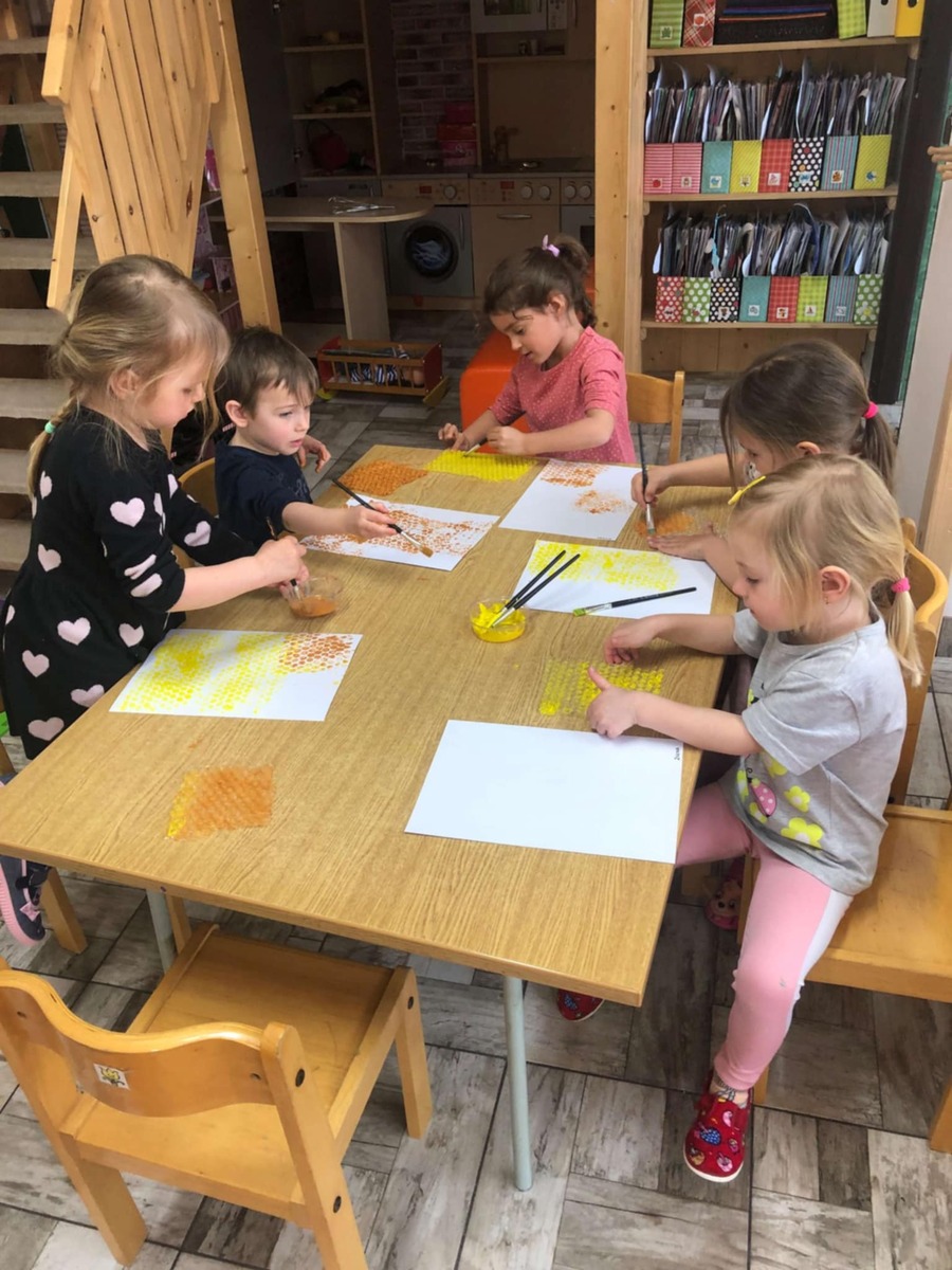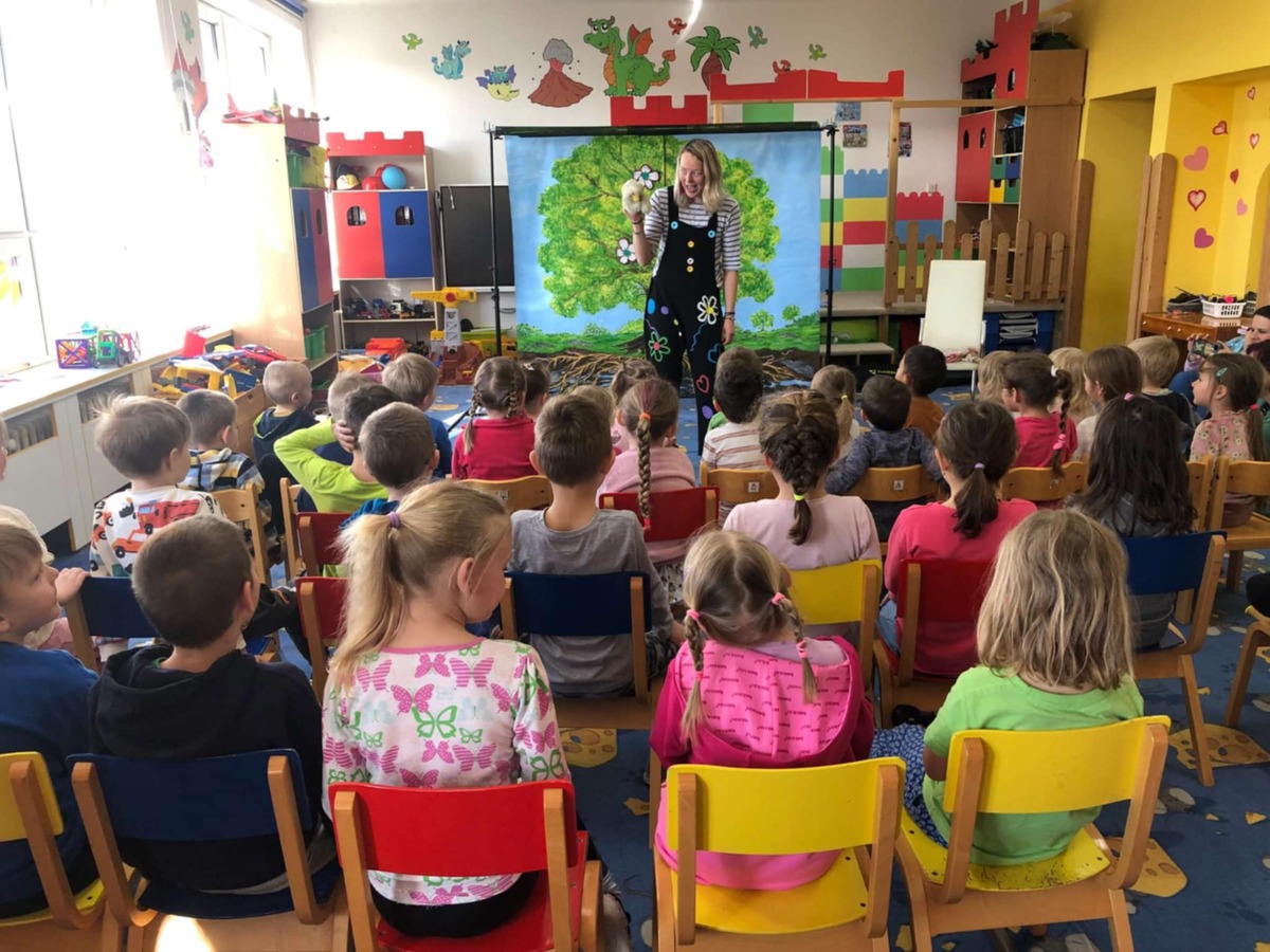 Děti se také seznámily s životem včel – kdo je včela, proč jsou pro nás důležité, jak žije roj a kdo vládne v úlu. Pomocí her si na chvíli vyzkoušely, jaké to je být včelou – sbírat pyl, vychutnat nektar, proletět se a stát se součástí úlu. Společně jsme vytvořili úl a louku plnou včel, což dětem pomohlo lépe pochopit význam těchto drobných, ale velmi užitečných tvorů. Téma včel dále podpořila i návštěva divadla U tří sluncí, které dětem předvedlo představení o životě včel a jejich roli v přírodě.