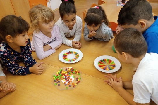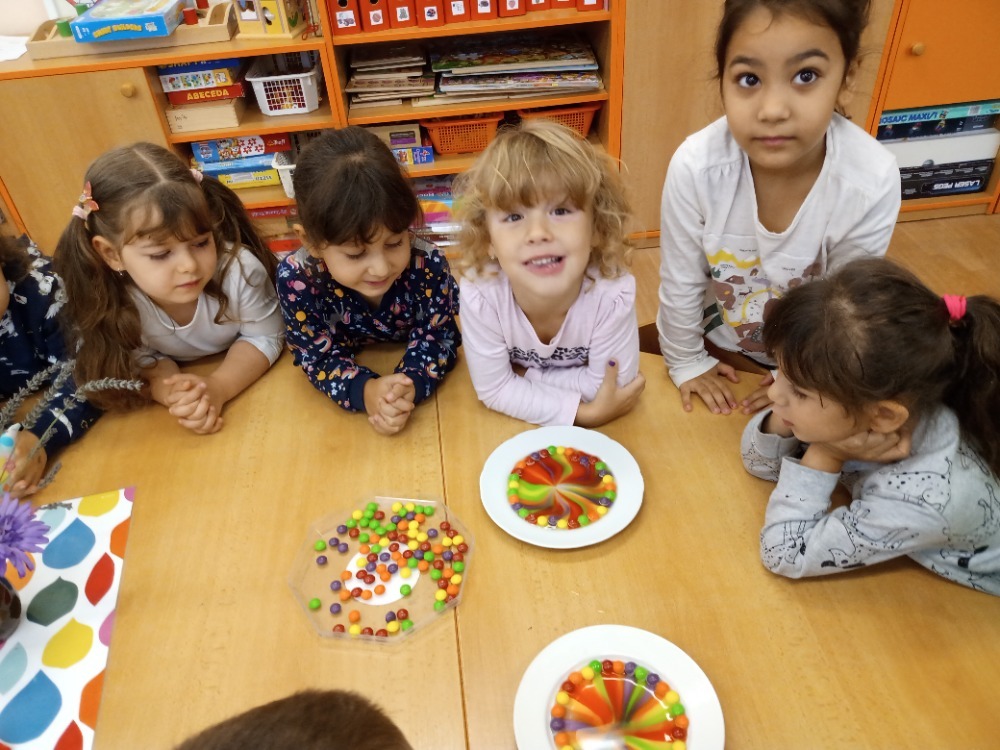 Líbila se nám představa duhy na talířku, duhu na obloze vidíme. Tak jsme pozorovali, jak se chutné bonbony rozpouští do barev. Jenže pak se rozpustily všechny barvy dohromady, jako v bříšku a to se nám moc nelíbilo. Radši jsme si dali jablíčko.