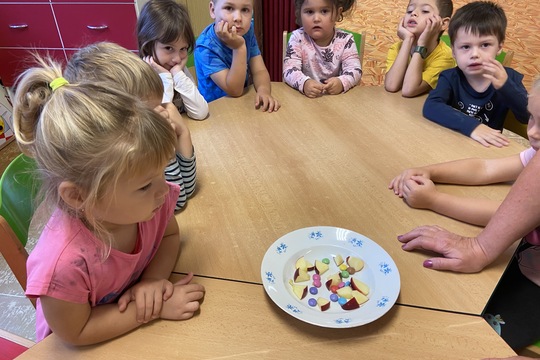 Duhový pokus jsme v naší školce zkoušeli poněkolikáté. Od září ale máme mnoho nových školkáčků, a tak jejich úvid byl veliký. Na pokus jsme použili klasické lentilky. Když je paní učitelka zalila vodou, úžas dětí se nesl celou třídou. Vysvětleno jim bylo, že efekt je to sice pěkný, informuje nás ale o tom, že krásně barevné bonbony jsou plné chemických barviv, které na chuť nemají velký vliv. Proto následovalo vyrábění zdravých bonbonů, bez chemických přísad.