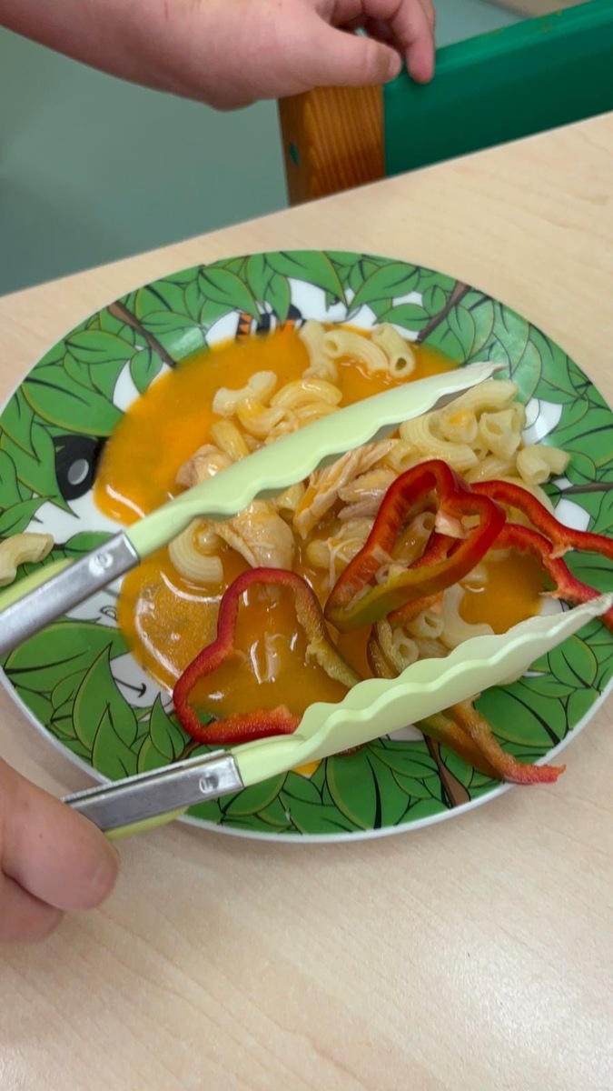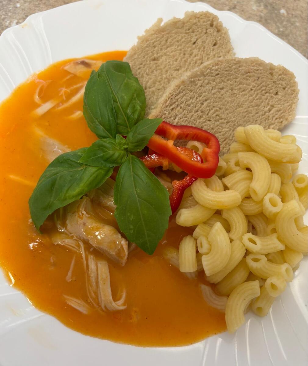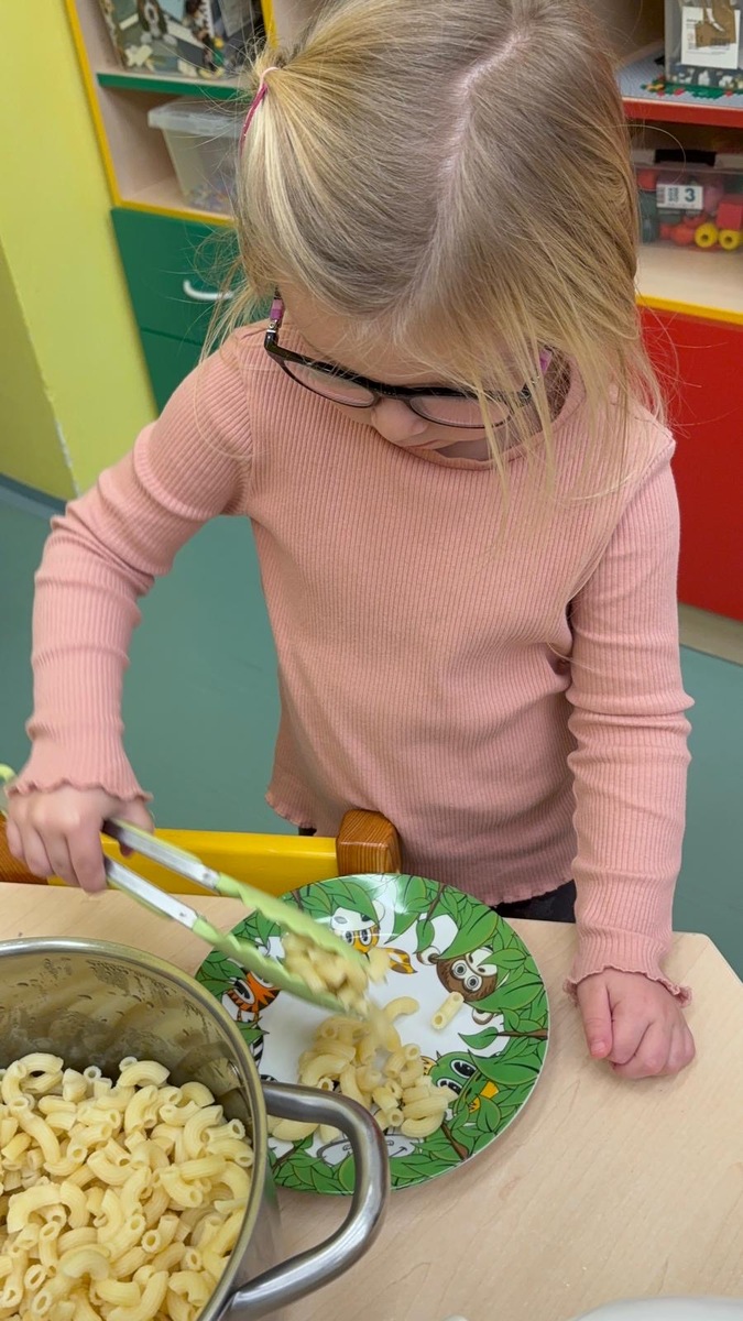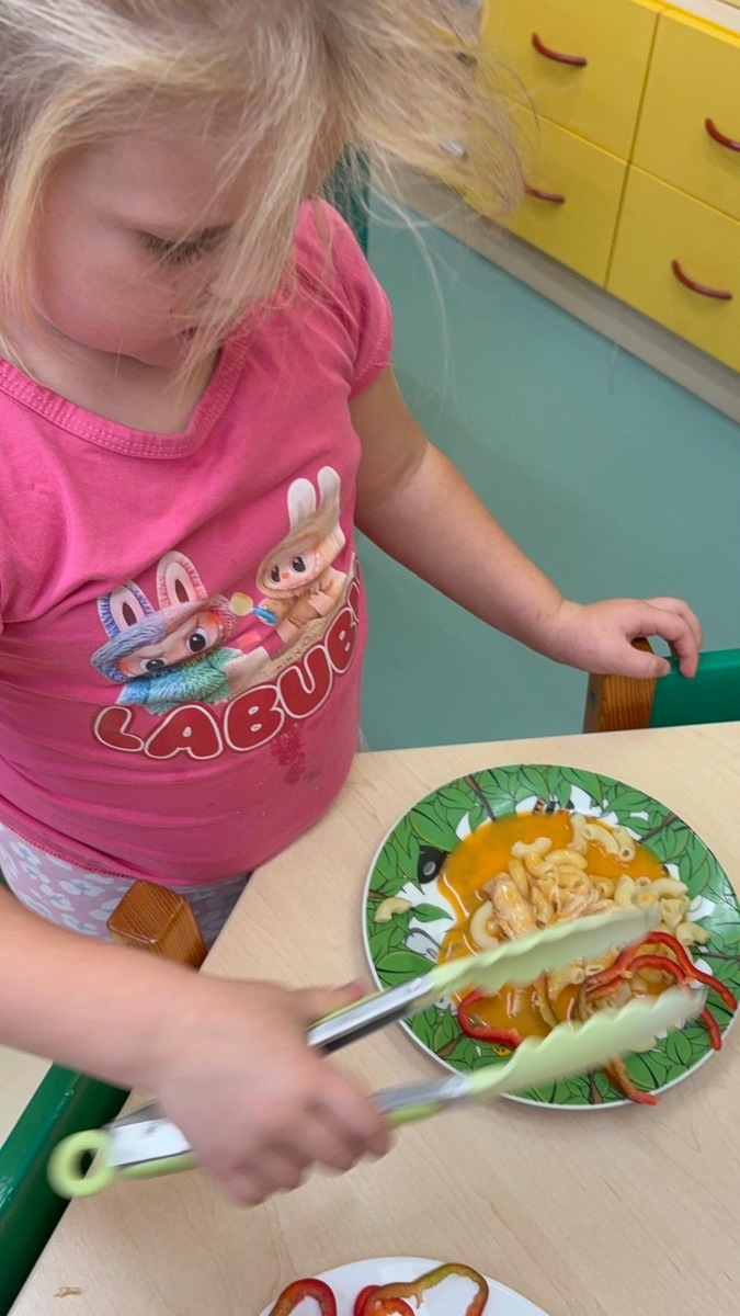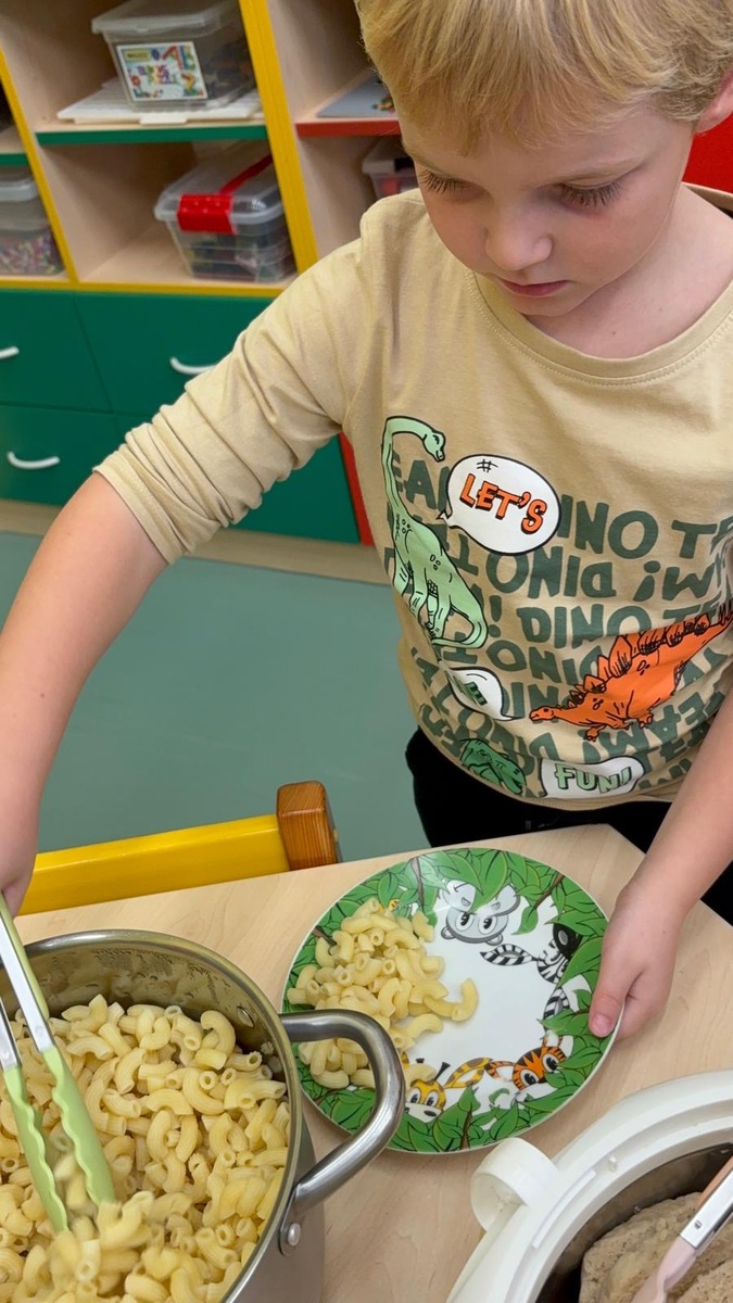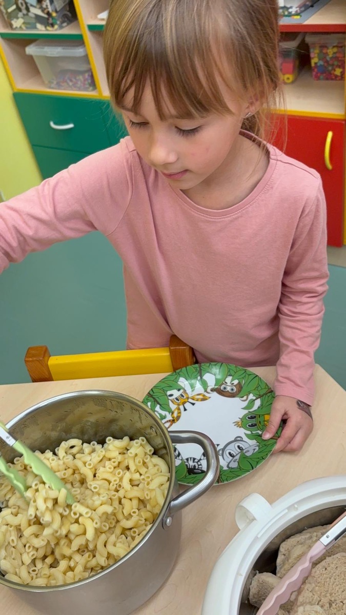 Možnost volby dvou příloh - těstoviny nebo špaldové knedlíky a kuře na paprice. Sebeobslužnost a možnost volby děti láká a má výhodu v prázdném- snědeném talíři.