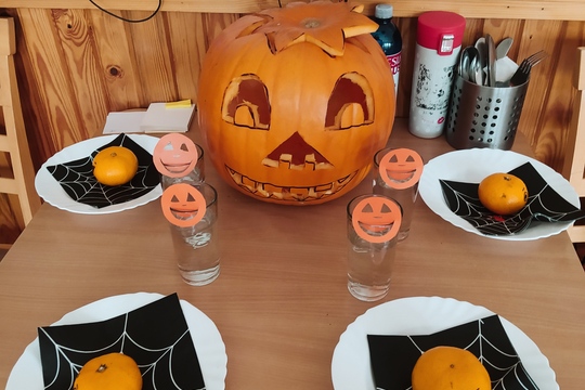 Dnešní den se nesl v duchu dýní. Děti z mateřinky si dýně vydlabaly, povídaly si o nich a zatančily si dýňový taneček. Paní kuchařky připravily dýňový oběd, výzdoba byla také tématická. Paní učitelka napekla dobrůtky. A nakonec nám oběd servírovali dýňový skřítci. Krásný podzimní den jsme si užili úpně všichni.