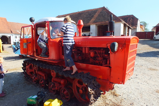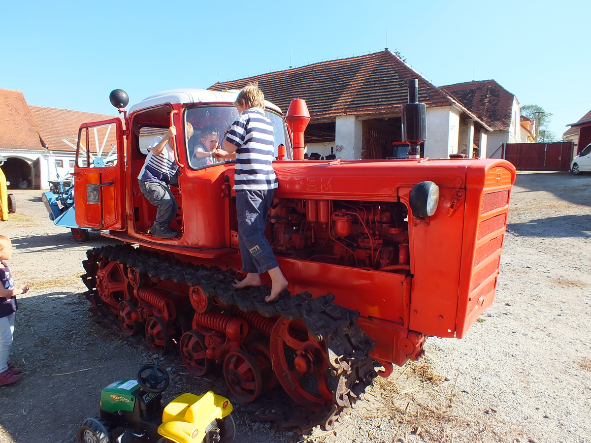Přivítal nás krásně opravený statek s atmosférou čilého ruchu a práce. Děti lákalo vyzkoušet si stroje staré i novější. Žebřiňák, traktor, žentour. Pozorovat Tatry při práci na býčí farmě.