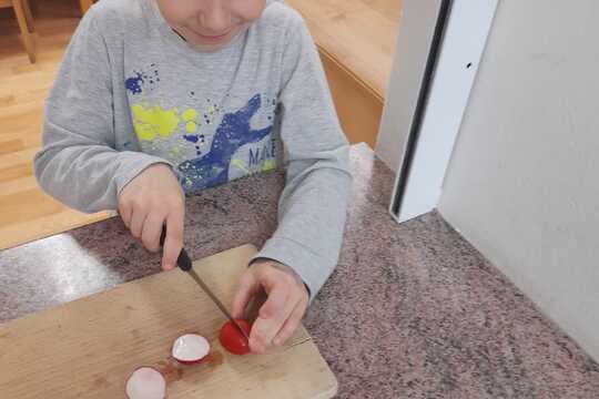 Dominik z naší školky s maminkou pravidelně navštěvuje farmářské trhy v Lounech. Tentokrát po dlouhé zimě ho napadlo přinést i pár kousků zeleniny na ozdobu ranních svačin. Nakoupil rajčata, mrkev a bylinky. Spolu s paní kuchařkou nakrájel rajčata - ochutil bylinkami a sýrem, dětem pak nabídl k svačině. Na odpolední svačinu nakrájel kedluben, mrkev a ozdobil toustový chléb. Všem moc chutnalo. Jsme moc rádi, že naši rodiče vodí děti na farmářské trhy, děti už znají jak která zelenina vypadá, jakou má barvu a vůni. Některé bylinky už poznají z naší bylinkové zahrádky a nové rádi očichávají a pak se v pondělí ptají paní kuchařek kam která bylinka patří. U polévky ti starší soutěží v poznávání zeleniny a vypráví si jak jim chutná.