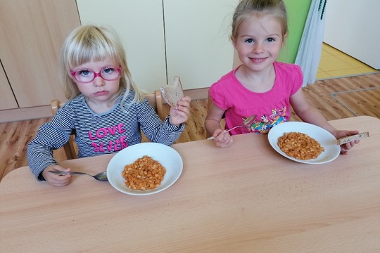 Dnes jsme všichni ochutnali nový pokrm : "FAZOLE PLAKI SE ZELENINOU". Pro milovníky luštěnin paní vedoucí školní jídelny přiložila i recept. Pravdou je, že některé děti byly nad talířem rozpačité, ale veskrze jsou to stále ty samé děti, doma se buď luštěniny nejedí, nevaří, nebo vaří, ale na jiný způsob, nebo prostě dětem nechutnají. Naší snahou je děti na takové jídlo namotivovat. Někdo používá písničky či pohádky o luštěninách, například "Jak se fazolky potkaly na talíři a říkaly si, že by si moc přály, aby dětem chutnaly :-)" Důležité je poznávat a ochutnávat s úsměvem, což se na jedničku podařilo ve Sluníčkové třídě. Děkuji. Michaela Vavřinová