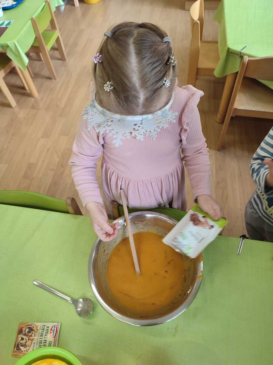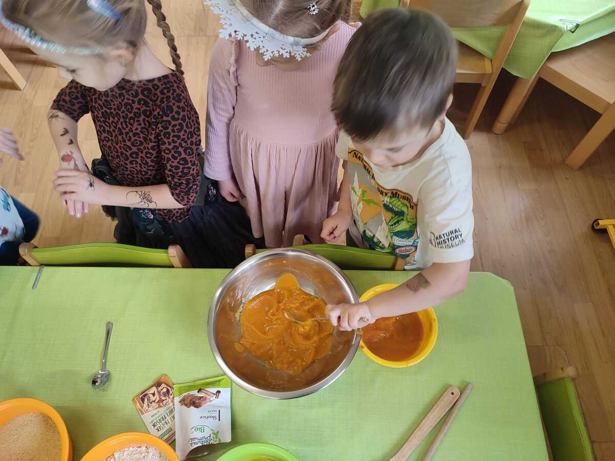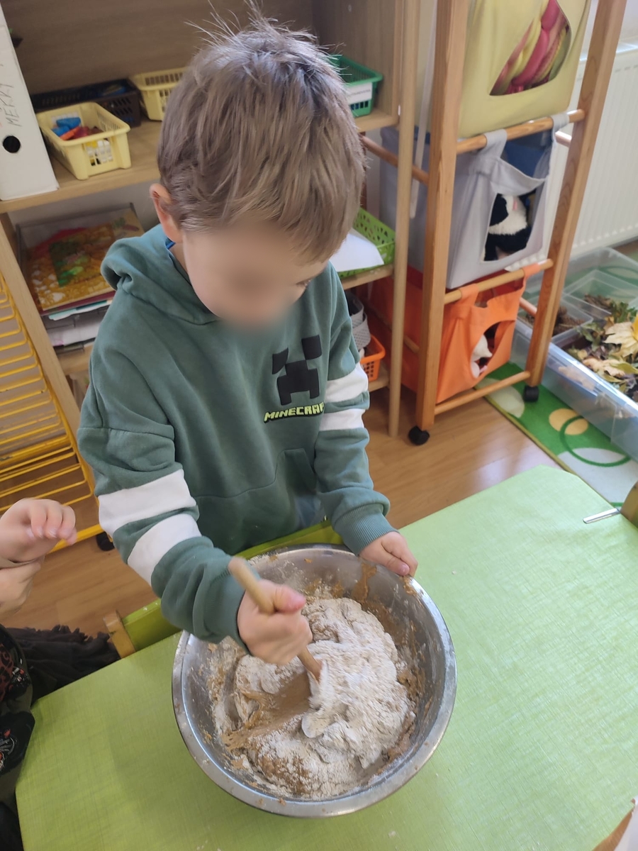 U stolečku v ranních centrech byly nachystané suroviny na přípravu těsta. Děti postupně dávaly do mísy dýňové pyré, rozpuštěné rostlinné máslo, třtinový cukr, skořici, celozrnnou špaldovou mouku a kypřící prášek. Míchaly, dokud nevzniklo husté těsto. To jsme pak nechali odpočinout v lednici a po svačině jsme pokračovali s vykrajováním sušenek. Postupně každý vykrojil několik strašidelných tvarů - dýni, kočku, lebku či bubáka - a dal na plech. Než jsme přišli ze zahrady, po celé školce už krásně voněly upečené sušenky, až se všem sbíhaly sliny. Na sušenkách jsme si náramně pochutnali! A pokud chcete recep, tady je.