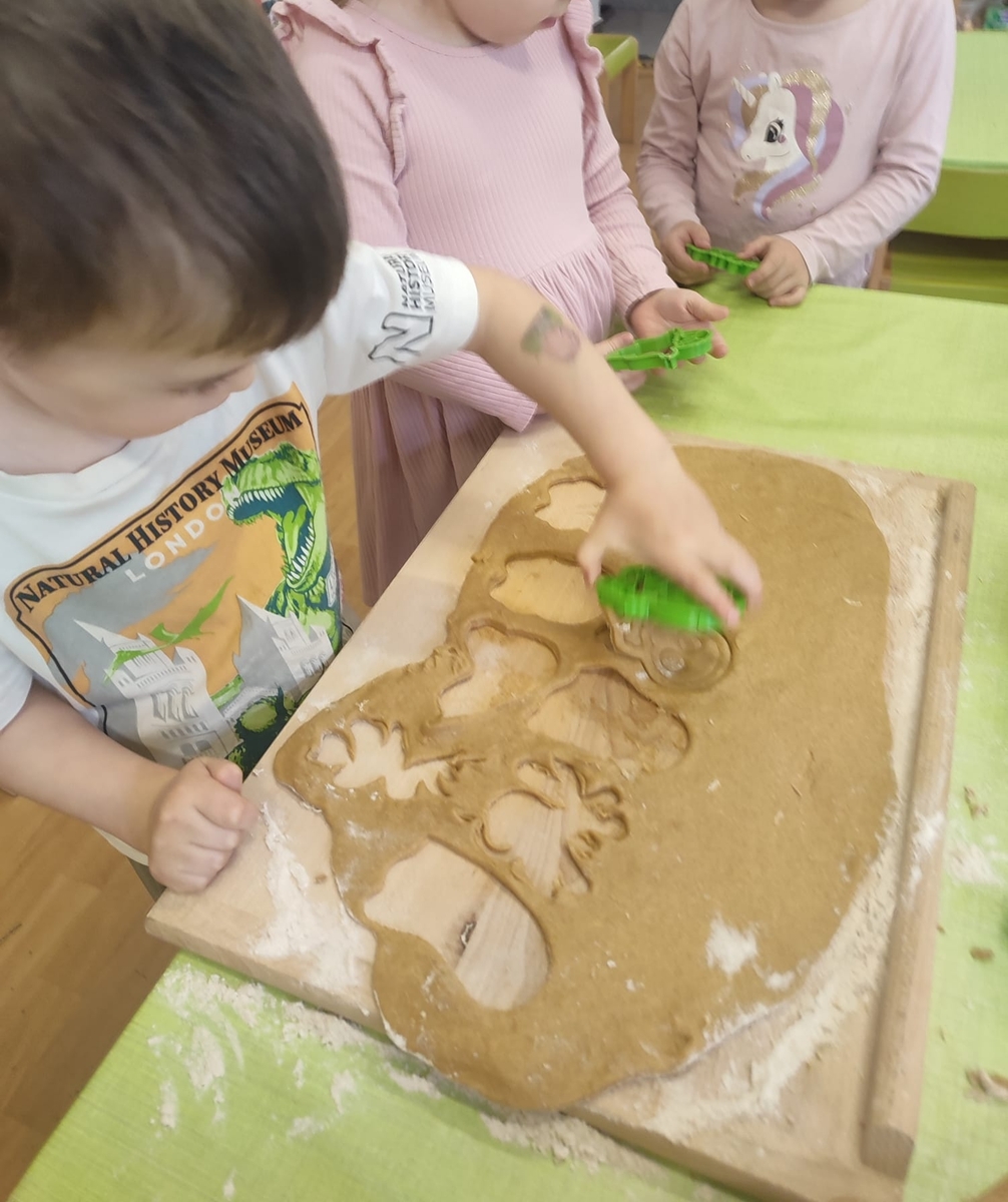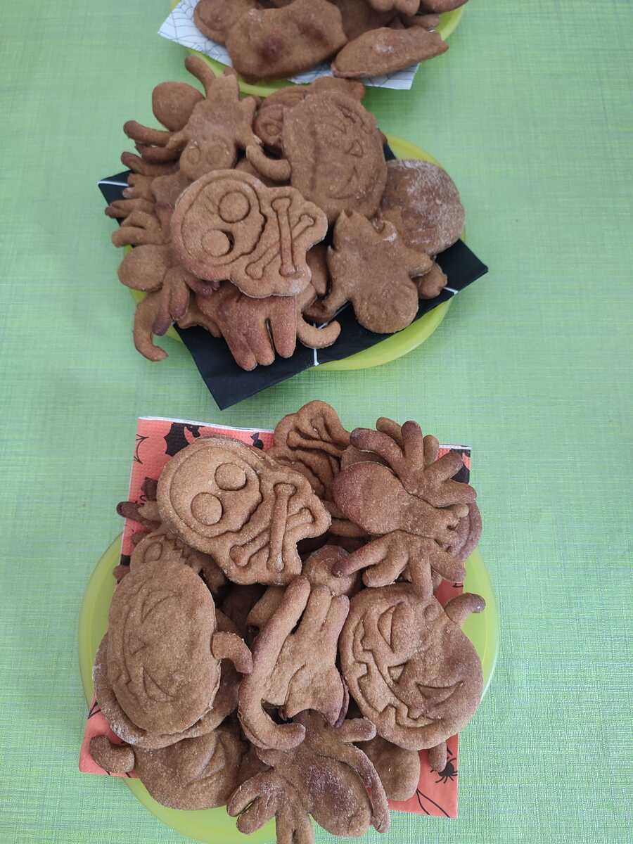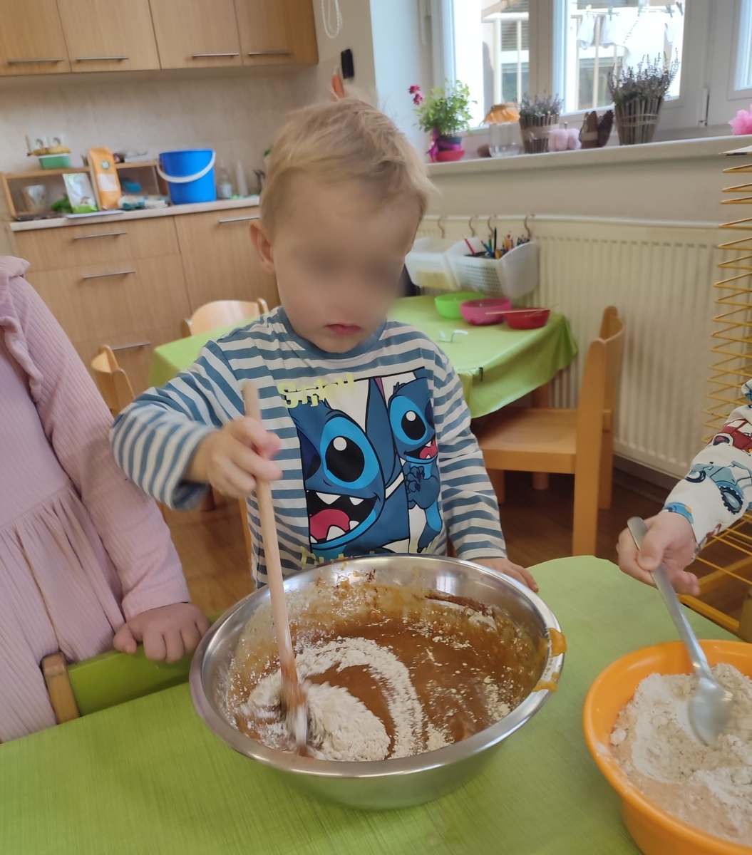 U stolečku v ranních centrech byly nachystané suroviny na přípravu těsta. Děti postupně dávaly do mísy dýňové pyré, rozpuštěné rostlinné máslo, třtinový cukr, skořici, celozrnnou špaldovou mouku a kypřící prášek. Míchaly, dokud nevzniklo husté těsto. To jsme pak nechali odpočinout v lednici a po svačině jsme pokračovali s vykrajováním sušenek. Postupně každý vykrojil několik strašidelných tvarů - dýni, kočku, lebku či bubáka - a dal na plech. Než jsme přišli ze zahrady, po celé školce už krásně voněly upečené sušenky, až se všem sbíhaly sliny. Na sušenkách jsme si náramně pochutnali! A pokud chcete recep, tady je.
