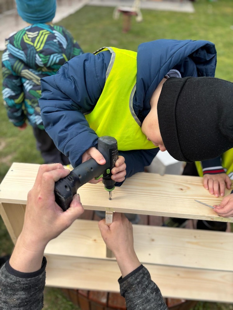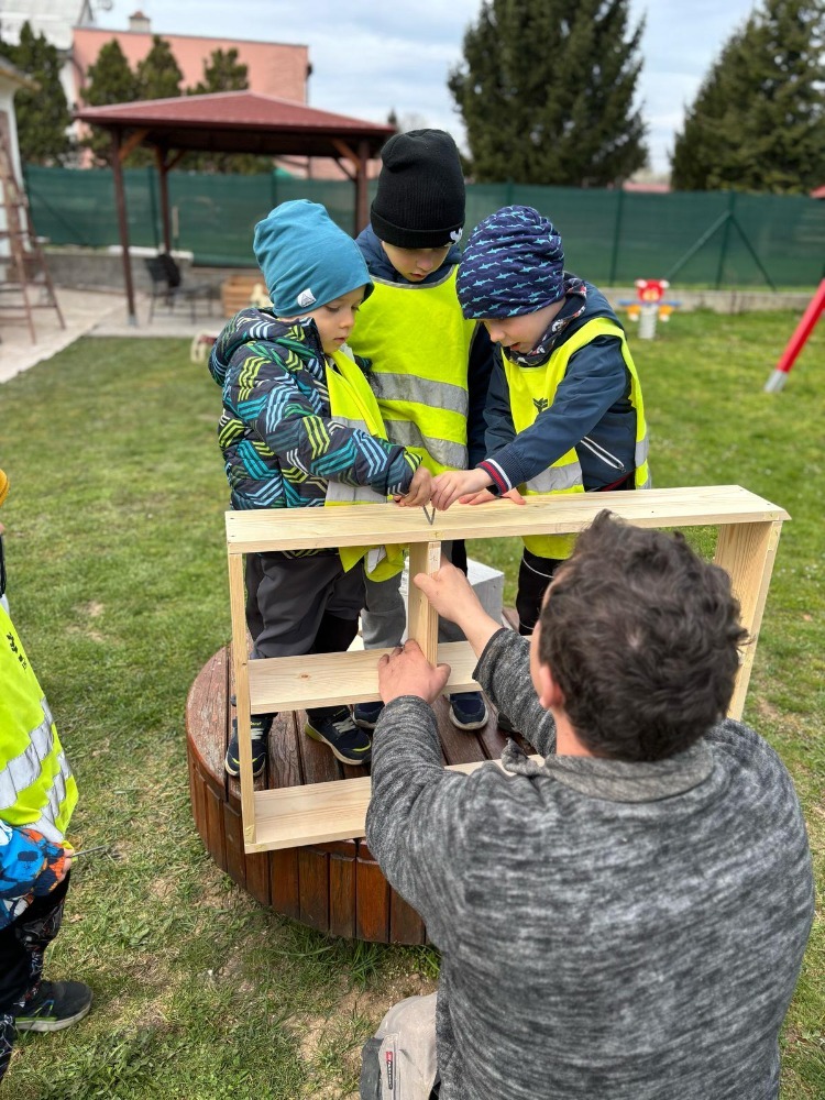 V pátek 11.04.2025 přijal naše pozvání pan stolař Tomáš Snopek a společně s dětmi vyrobil tzv. Hmyzák. Děti si mohly vyzkoušet správné složení domku dle čísel a následné sešroubování dohromady. Aktivita bavila zejména kluky, kteří se tak trošičku přiblížili stolařskému řemeslu. Timto děkujeme panu Snopkovi a přejeme mnoho úspěchů v pracovním i osobním životě. Výsledek naší práce můžete vidět 23.05.2025 při otevření naší jedlé zahrady.